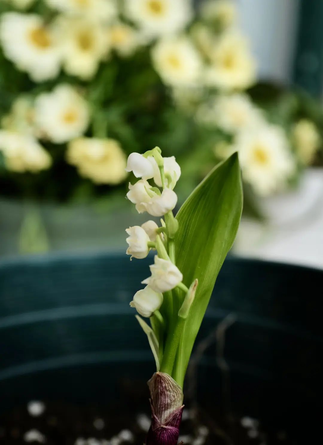 铃兰喜半阴的环境,发芽后放在散光充足的地方,避免太阳直射。看着绿芽长大舒展出叶子来,最后长出来一串串风铃般的白色铃兰花。虽然花蕾特别迷你,但沐浴在阳光下随风摇曳的小白花在五月显得特别清新怡人。