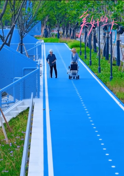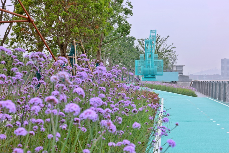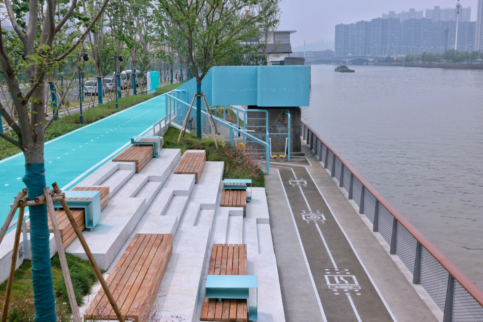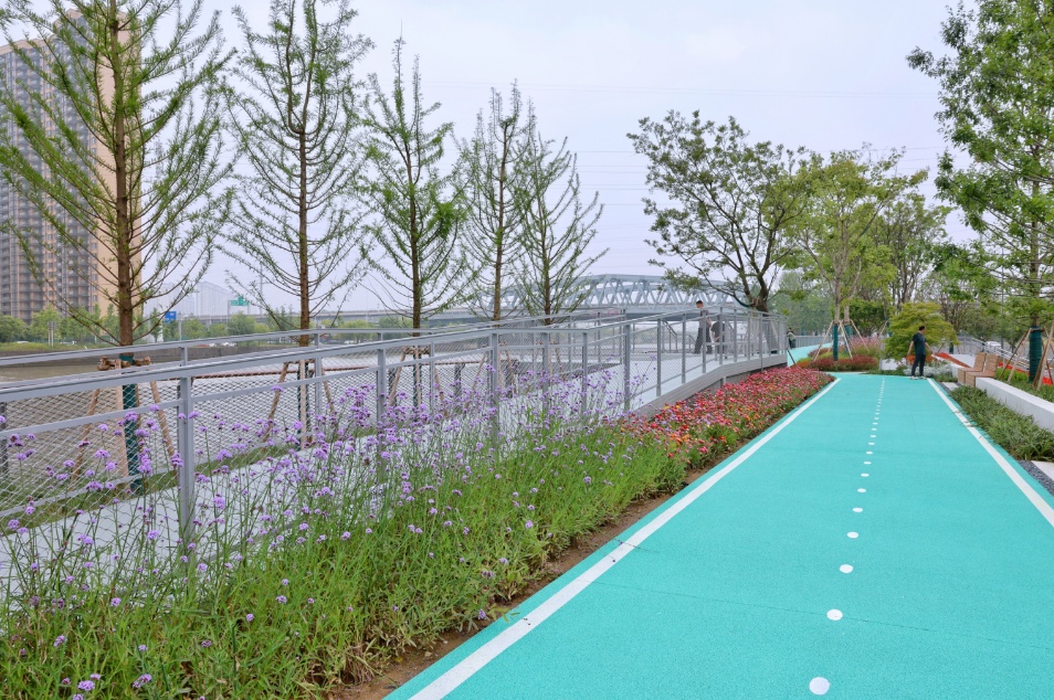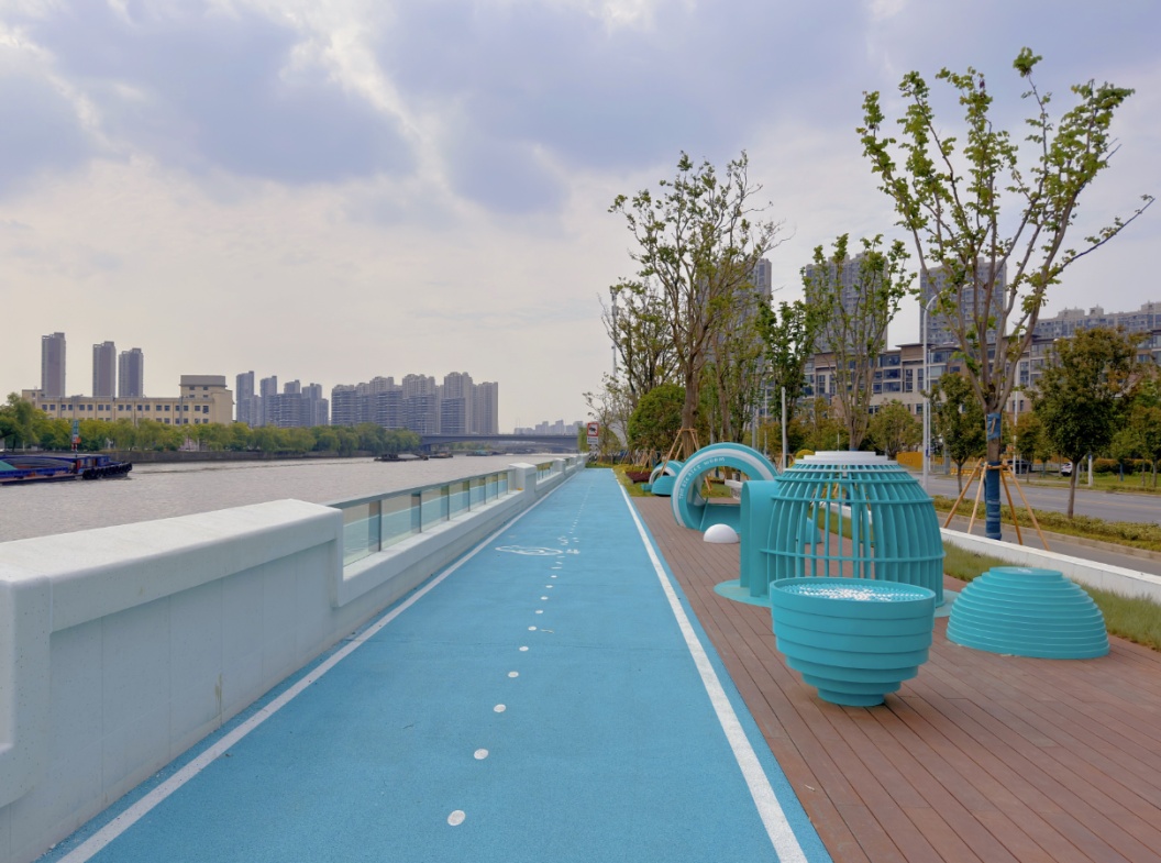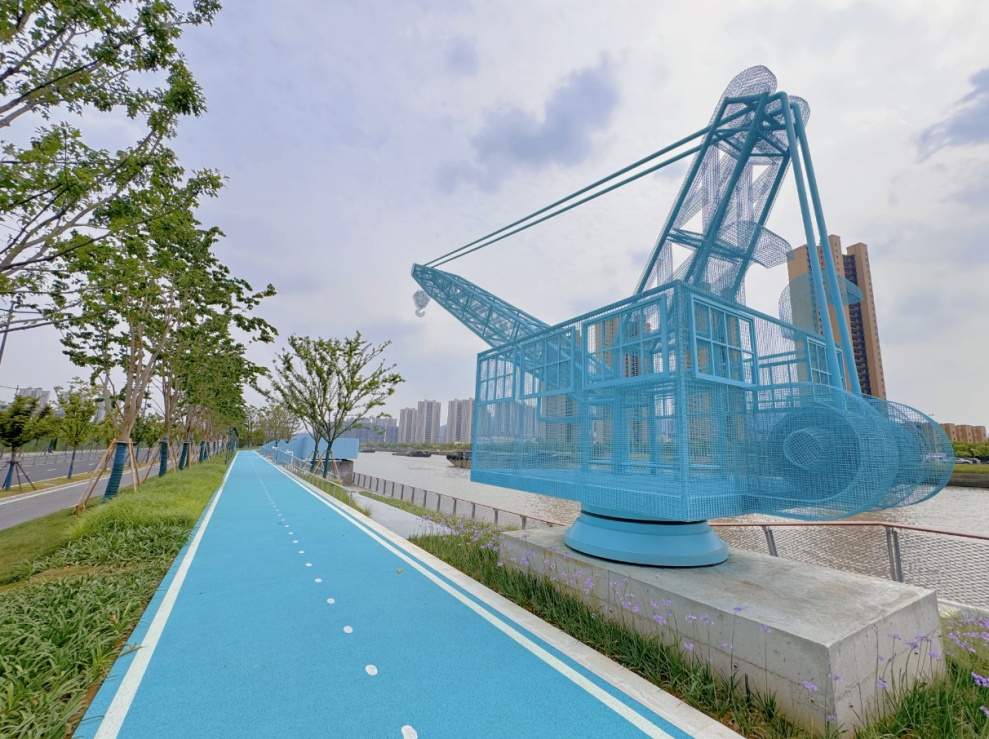 沿河一路走,一路皆是景。从山北大桥至凤翔路的“绿茵湾”兼具颜值与内涵。结合周边居住用地,这一主题段强化了岸线与腹地的联动,有桥畔乐园、水湾小坐、杉影游廊、石台远望、站旁幽径以及浮栈观水等多个景观节点,500平方米的桥下全龄健身空间、林下转角休憩空间,每一处设计都极具人性化,且艺术感十足。记者注意到,原本船只停靠的驳岸和吊机底座得以保留,也换上了一袭“蓝装”,以现代装置艺术的方式呈现,在守护历史记忆的同时,更打造了新地标,成为河畔的一处打卡点。