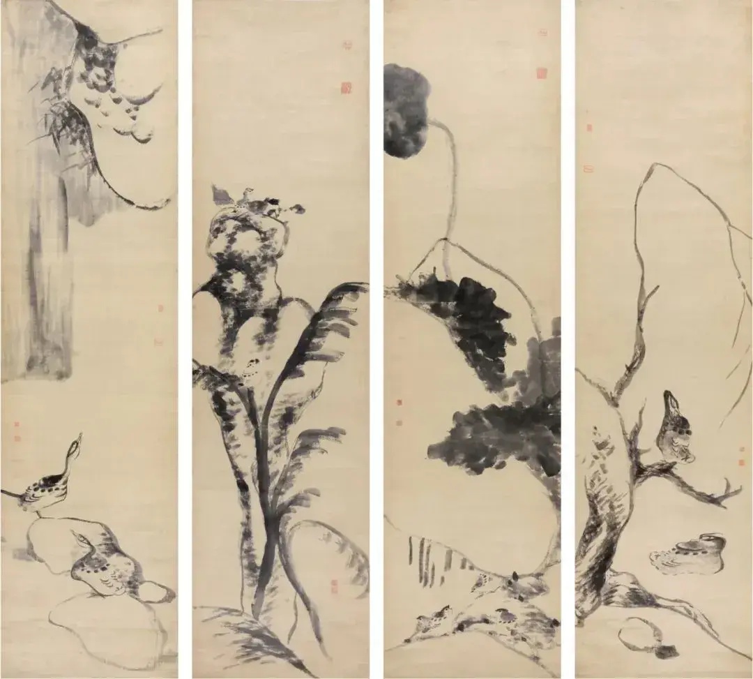 清·朱耷(1626—1705),《鸟鸭图 》,条屏(四条),绫本水墨,208×55cm×4