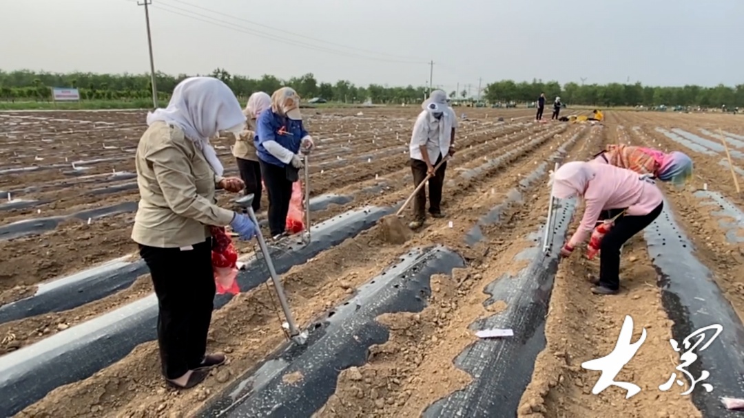 5月24日,在山东省黄三角农高区盐碱地农业试验示范基地的大田里,一群头戴遮阳帽、用口罩把脸遮挡得严严实实的当地妇女,正在两个学生模样的小伙安排下,辛勤播种着试验花生。