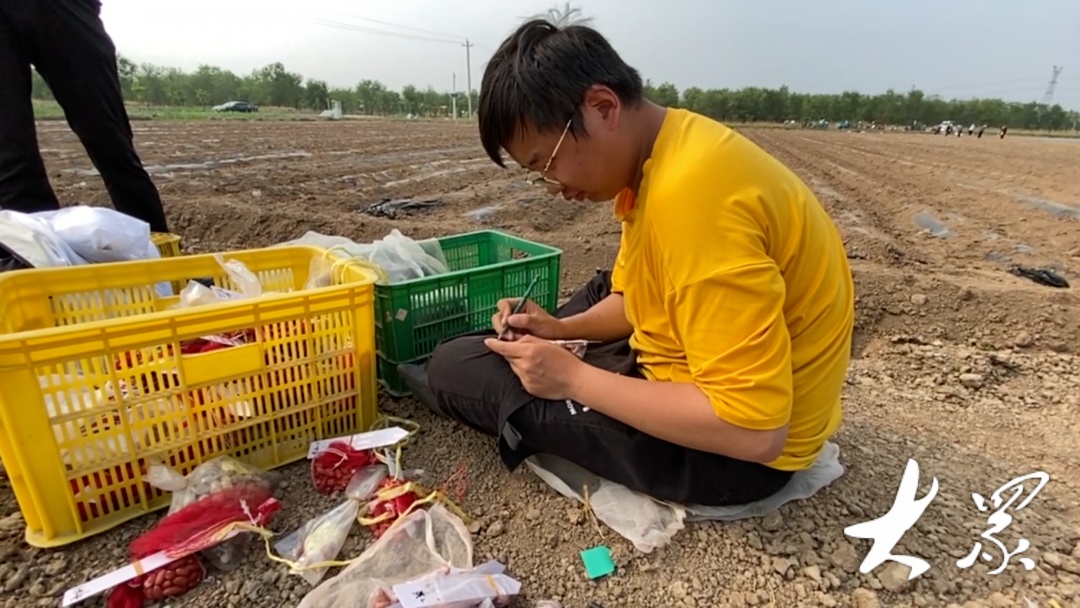 正在地里忙活的研二学生于复欣,师从团队的乔利仙教授,他的研究方向是花生耐盐碱育种方向。坐在田埂上,他一边给每袋花生种子编号,一边分发给同学任建军,再由任建军分发给村民种植,两人配合十分默契。为了方便低头工作,于复欣连个遮阳帽都没戴,整个脸都被晒得黑中透红。