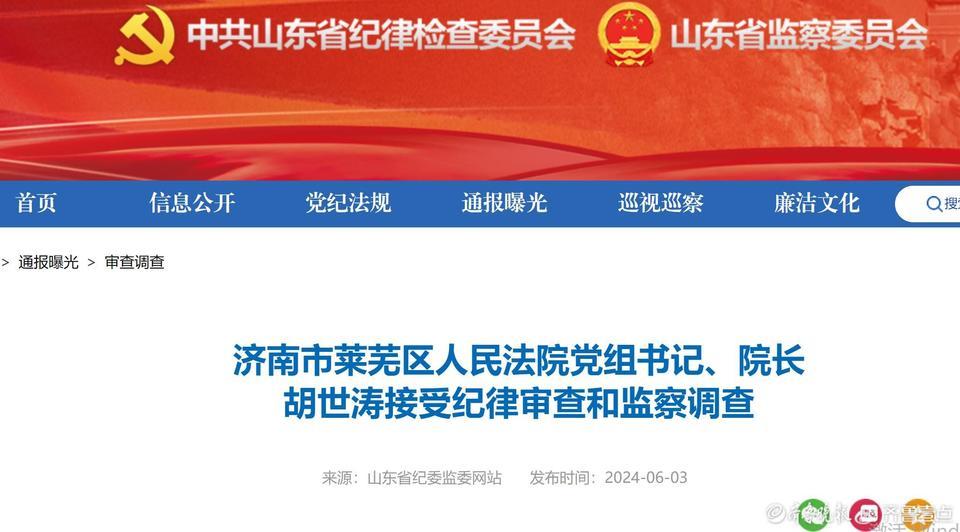 6月3日,山东省纪委监委网站通报,济南市莱芜区人民法院党组书记、院长胡世涛接受纪律审查和监察调查。