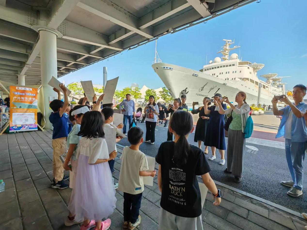 两位志愿者老师一边为他们讲解远望一号是中国自行设计、建造的第一代综合性航天远洋测量船,一边将五颜六色的马克笔包、水彩盒、笔刷、调水盒,以及硬板绘画纸放在小椅子旁,耐心引导小朋友们用好写生工具,学会观察和欣赏大船的外形构造细节,绘出自己心目中最亮丽最可爱的图画来。果然,孩子们在志愿者老师的指引下,绘出一帧帧奇思妙想、美丽非凡的“远望一号”。