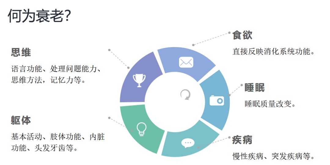 衰老通常在食欲、思维、睡眠、躯体功能和疾病状况等方面表现出来。消化系统功能减弱,思维和记忆力下降,睡眠质量改变,基本活动和肢体功能减退,以及慢性疾病和突发疾病的发生,都是衰老的常见迹象。