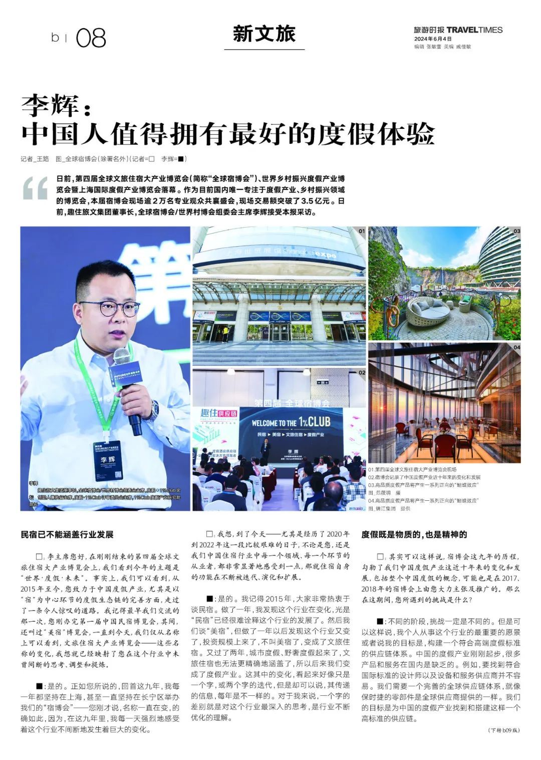 日前,第四届全球文旅住宿大产业博览会(简称“全球宿博会”)、世界乡村振兴度假产业博览会暨上海国际度假产业博览会落幕。作为目前国内唯一专注于度假产业、乡村振兴领域的博览会,本届宿博会现场逾2万名专业观众共襄盛会,现场交易额突破了3.5亿元。日前,趣住旅文集团董事长,全球宿博会/世界村博会组委会主席李辉接受本报采访。
