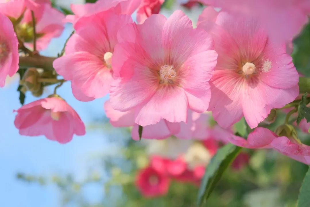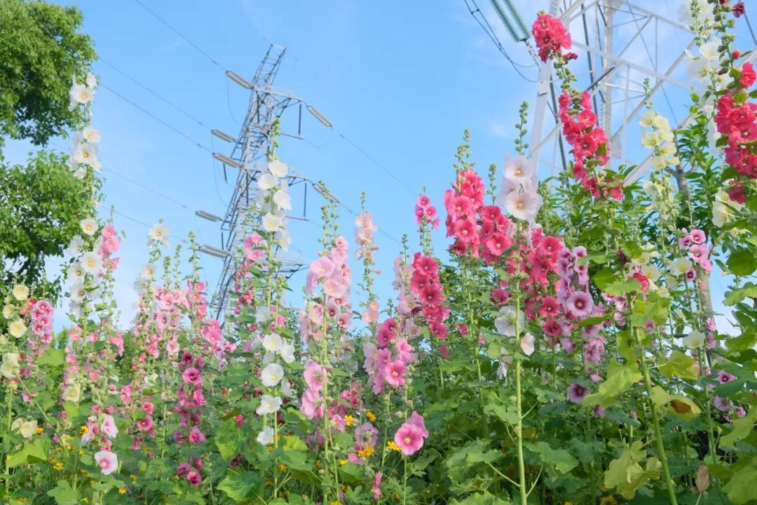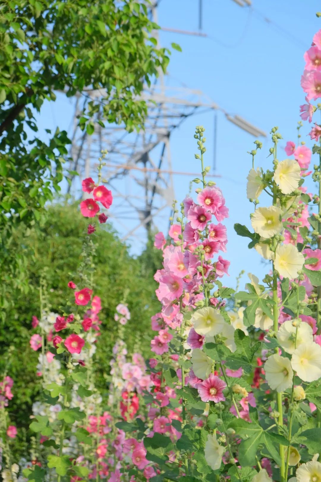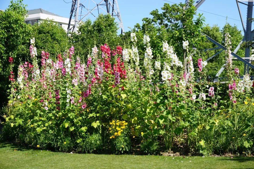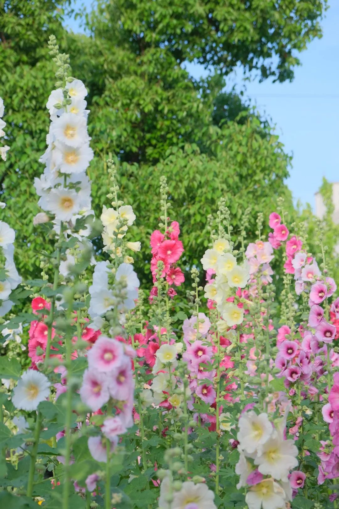 步入彭浦四季公园的春园,只见株高2米的蜀葵开得热闹,花朵足有巴掌大,单瓣、重瓣,浅粉、玫红、洁白、鹅黄……艳而不俗,竞相争艳,成片绽放颇有乡间山野的意趣。