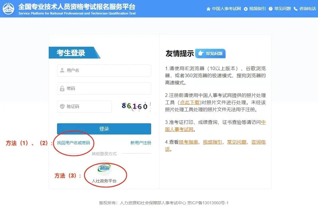答:目前可以通过网上报名系统“找回用户名或密码”功能找回,目前支持三种找回方式:(1)密码找回问题;(2)手机验证码;(3)其他登录方式-人社政务平台登录后重置密码。