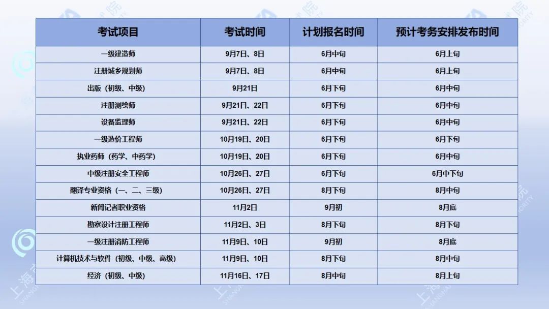 考试报名具体时间和要求以本市考务工作安排通知为准,广大考生可关注上海市职业能力考试院网站(www.rsj.sh.gov.cn/spta.shtml)“考务安排”和“考试项目”栏目信息。