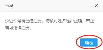 如果姓名有误,重新注册时,系统可能会提示“该证件号码在注册库中已经存在”,点击“确定”继续操作即可。