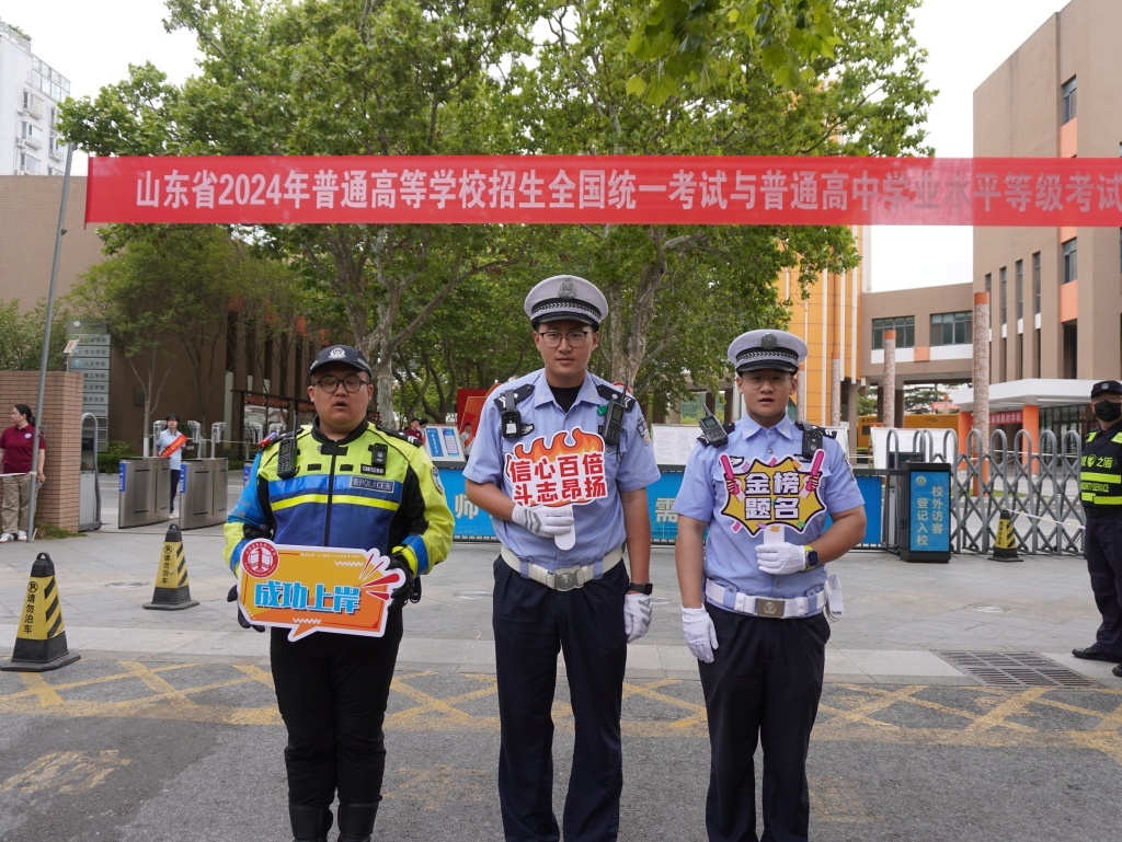在护考现场,青岛一中、青岛二中分校门口市南大队民警与考生“击掌”“点赞”,为他们加油鼓劲。市南交警也为我们的考生们精心制作“畅安护考-市南交警祝广大考生金榜题名”的横幅,助力莘莘学子追梦远航,同时也为我们广大考生和家长带来了满满仪式感和安全感。