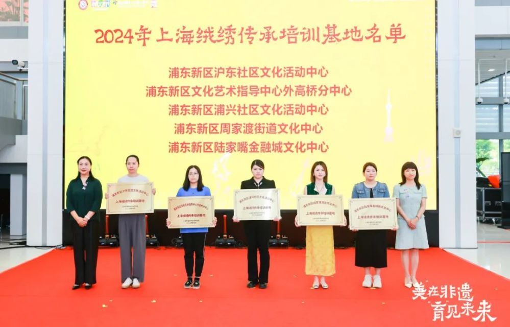 这是此次活动现场的动人一幕。紧随其后,上海绒绣传承培训基地的名牌,在现场被授予了周家渡街道文化中心、陆家嘴金融城文化中心、浦兴社区文化活动中心、沪东社区文化活动中心、浦东新区文化艺术指导中心外高桥分中心这5家单位。至此,浦东新区在全区乃至在新疆、云南等地设立的上海绒绣传承培训基地增至21家。