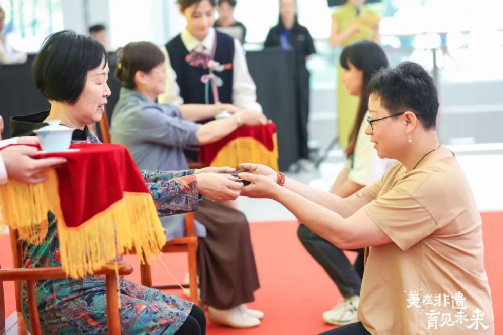 “师父,请喝茶!”在浦东新区文化艺术指导中心大厅里,两位年轻绣娘在数百位市民的见证下,向上海绒绣国家级非遗传承人唐明敏和许玉红敬茶。两位传承人庄重地接茶,喝茶,然后回赠给两位绣娘精美的针线包。“礼成!”随着主持人的宣布,现场响起一片掌声。