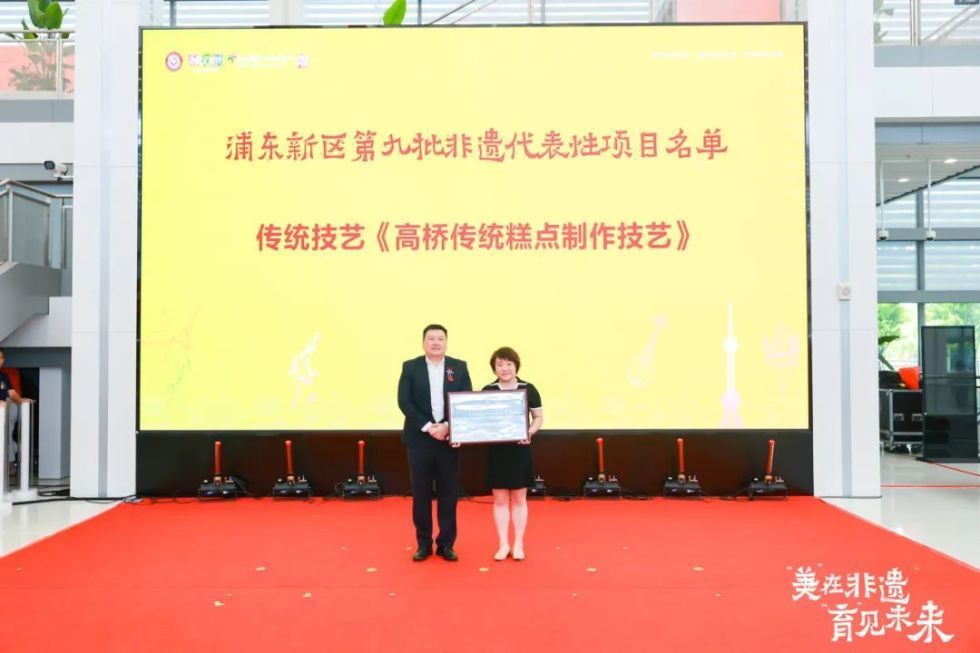 仪式现场为浦东新区第九批非遗代表性项目“高桥传统糕点制作技艺”颁牌,至此,浦东拥有各级非遗项目增至84个,数量位居全市前列;为浦东新区第九批非遗代表性传承人共计15人颁证,其中最年轻者为“90后”;见证国家级非遗项目“上海绒绣”传承人喜收新徒、揭牌全新传承基地。现场非遗表演者中更不乏“00后”、“10后”的身影,无不昭示着浦东非遗薪火相传、后继有人。