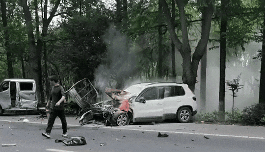 突然“轰隆”一声巨响声传来,虞飞翔一惊,赶紧停下手中的活儿,冲出修理铺去看发生了什么事。只见马路对面的庙子河路口,发生了一起两车相撞事故,其中一辆白色SUV车身已经蹿出了火苗,情况危急。