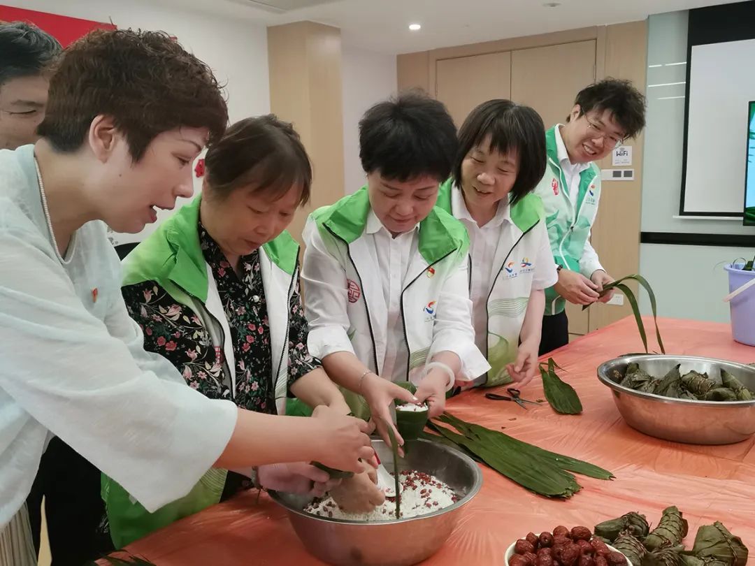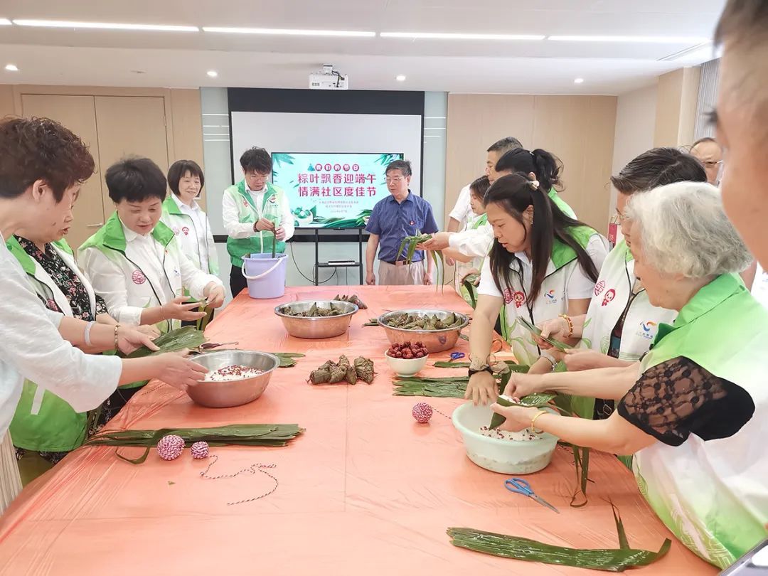 在“粽叶飘香包粽子,邻里情深共分享”包粽子环节,粽叶、糯米、红枣赤豆等食材早已准备就绪,在大家的巧手下,一片片粽叶被巧妙地折成漏斗状,糯米和馅料被巧妙地填入其中,再用细绳紧紧系住,一个个形状各异的粽子便诞生了。包粽子不仅是一项传统技艺,更是一项团队协作的活动。在包粽子的过程中,大家互相帮助、交流心得,现场欢声笑语不断。
