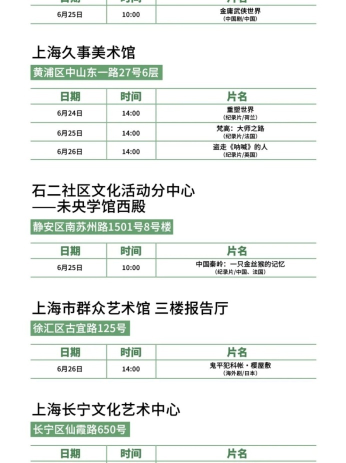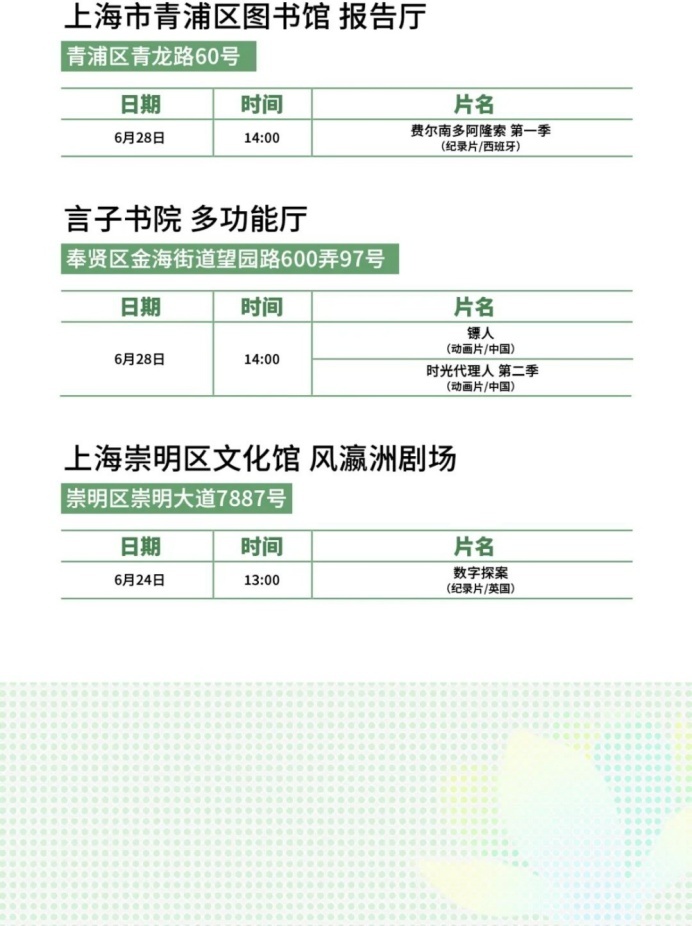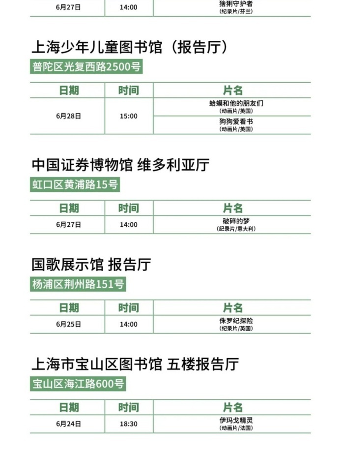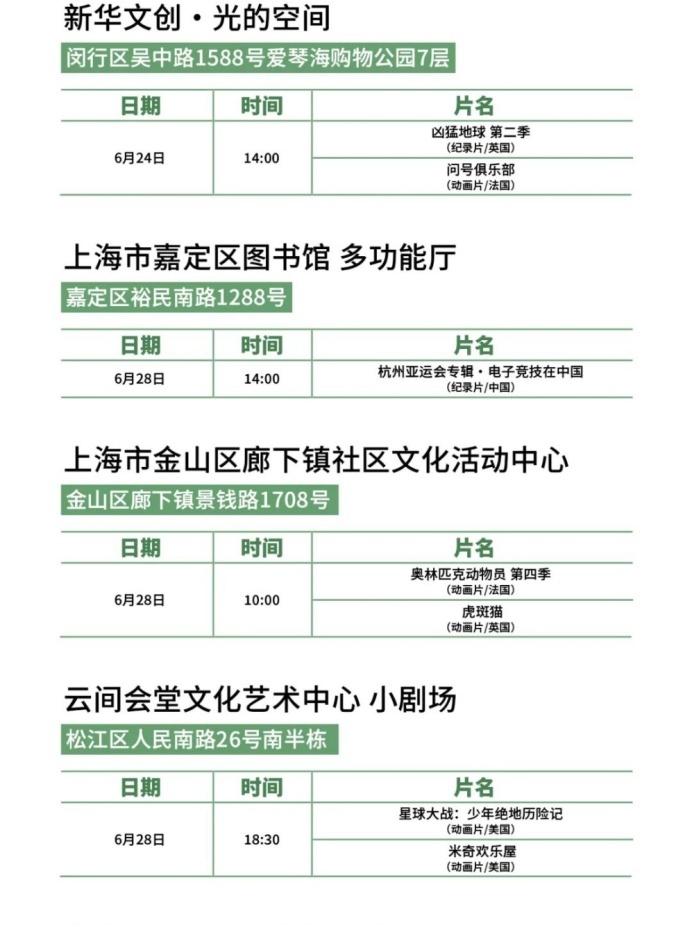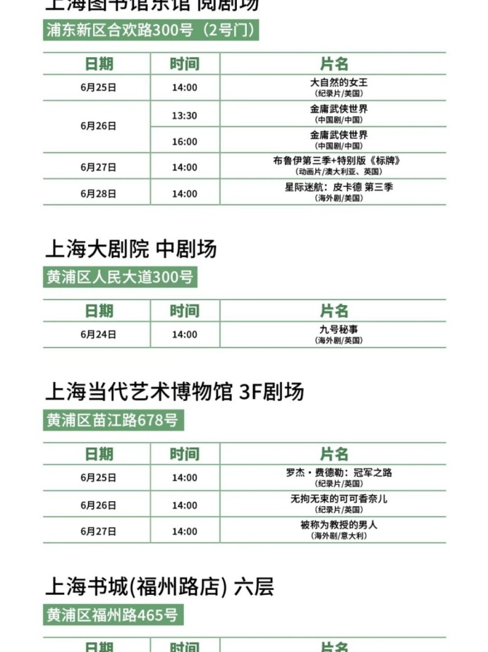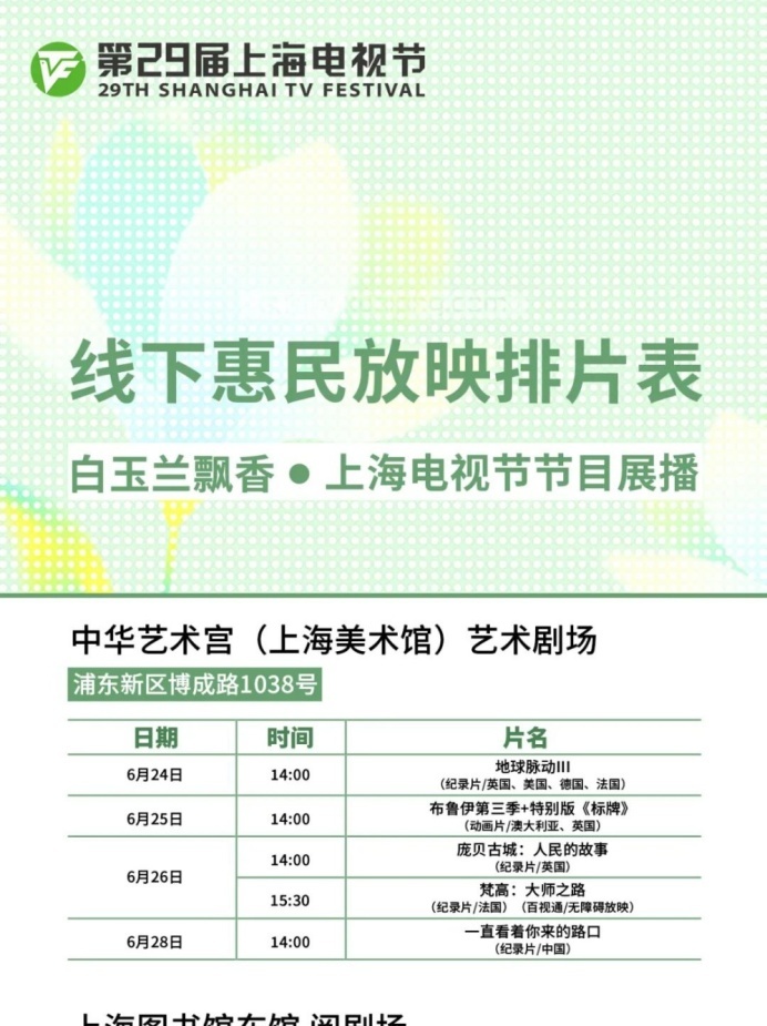 上海国际影视节中心介绍,第二十九届上海电视节将于6月24日至28日举行。今年,隶属于“白玉兰飘香”上海电视节节目展播的线下惠民放映导赏活动将持续打造“家门口的电视节”,放映点从去年的18处继续扩展至20处,展播和放映30余部/集白玉兰奖优秀报名作品,16个区的市民可以选择家门口的文化空间欣赏海内外佳作,并与全球影视人面对面交流,让艺术滋养触手可及,让城市美育浸润每个角落。本届电视节惠民放映将于6月17日开放预约通道,观众可通过大麦手机app预约。排片表详见↓