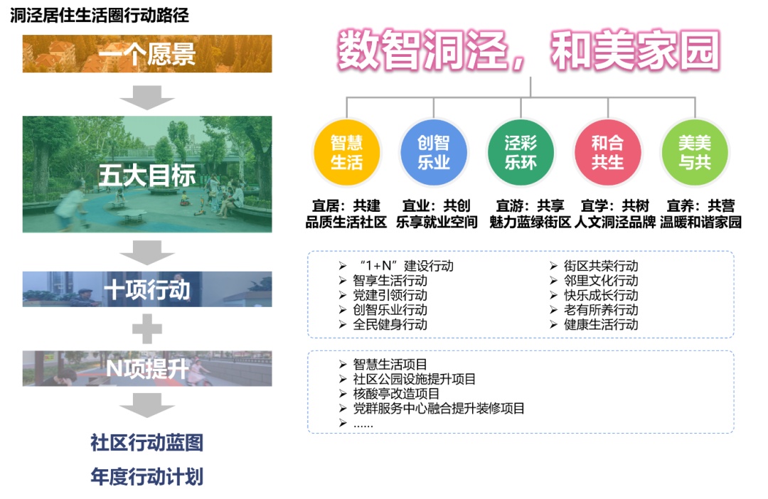 根据洞泾镇问需求计调研结果,结合松江区划示的“15分钟社区生活圈”基本单元, 规划形成“一个愿景,五大目标,十项行动,N项提升”的社区行动蓝图和年度行动计划。以“数智洞泾,和美家园”为愿景,围绕“一环三心八驿站”的规划结构,布局洞泾特色的“1+N”空间模式。