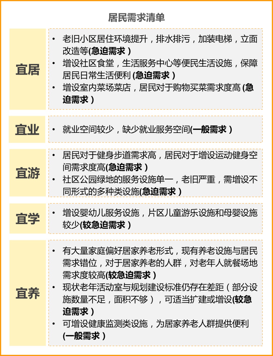 根据居民问卷、现场走访,对街道各类人群的需求进行总结,同时对街道各类人群对设施的需求急迫程度,进行了排序统计,最终形成公众急难愁盼需求清单。