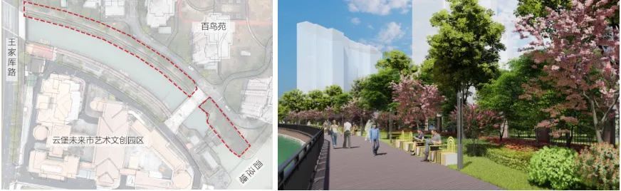 北小桥河东岸滨水景观提升工程,改建部分桥侧栏杆,新建木栈道、艺术座椅、园路小径、景观小品、泵站东侧花墙以及建筑围墙粉白,新增绿化种植以及景观灯光布置。