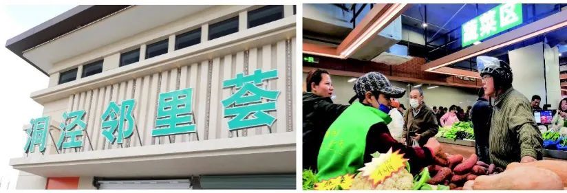 在15分钟社区生活圈的集中走访调研中,居民提出对室内菜场的迫切需求。洞泾镇积极行动建设,率先完成位于泗泾南拓展大居的洞泾邻里荟建成开业。室内菜场面积约1600平方米,分为沿街商铺和市场内零售摊位。市场内品类齐全,物美价廉,全场设置智能电子秤、全覆盖的监控设备、中央空调、地下停车库等设施,让居民拥有更好的消费体验。