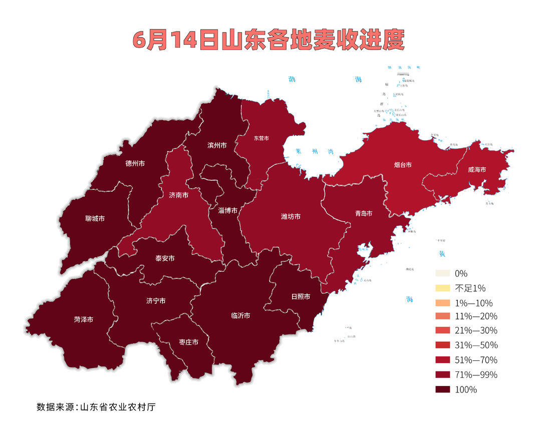 从各地来看,枣庄、济宁、临沂、菏泽、泰安、聊城、日照、淄博、德州、滨州10市麦收基本结束,济南、潍坊、东营3市收获过九成,青岛收获过八成,烟台收获近六成,威海收获过五成。