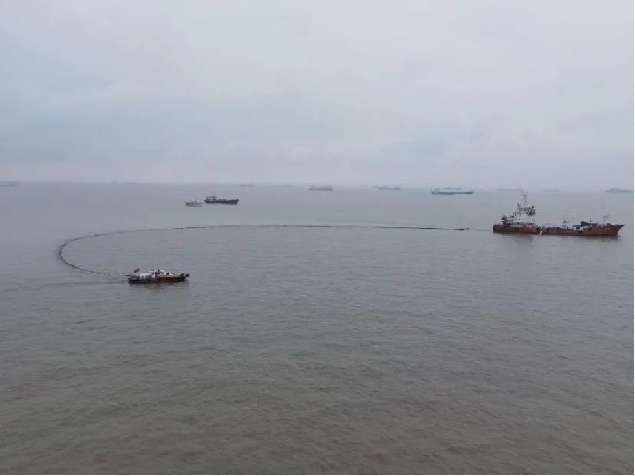 浦东海事局接警后立即启动应急响应,组织、协调有关单位开展应急处置。指挥中心第一时间指派无人机飞抵原油泄漏现场对污染水域进行勘察,指派海事巡逻艇迅速赶赴污染水域进行交通管控,避免发生次生事故。同时,协调岸上消防救援队伍随即奔赴现场开展防火防爆及相关应急处置工作,协调辖区应急清污力量赶往溢油现场围控、使用吸油毡清除水面溢油。最后,再次出动无人机低空勘察并结合水上溢油监测系统监测数据确认污染水域清污效果。