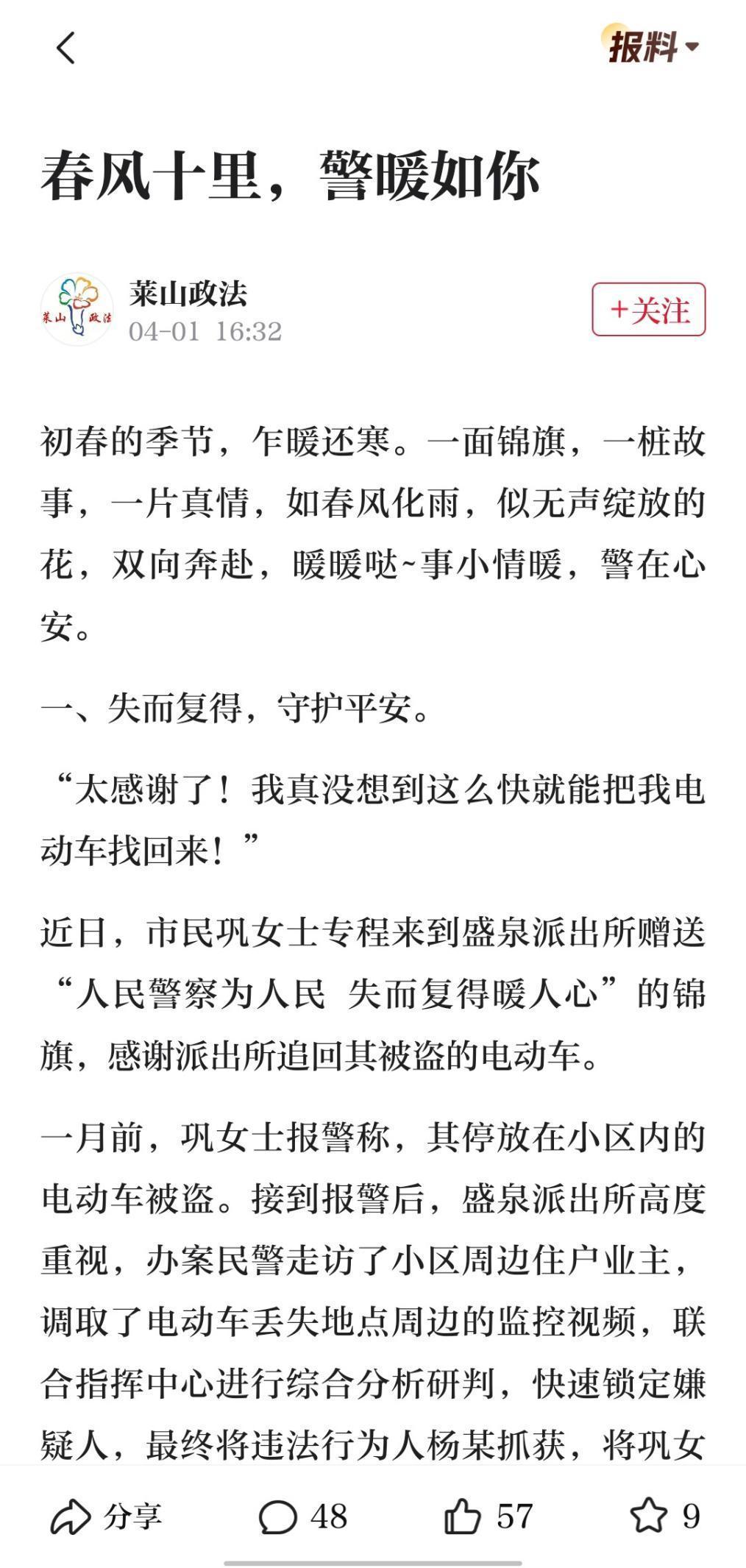在温度方面,“莱山政法”聚焦了一批政法暖新闻。以政法系统帮助群众开展的找回被盗电动车、搜寻走失老人等为民实事为切入点,发布了《春风十里 警暖如你》《连夜搜寻!走失老人找到了!》等内容,搭建莱山政法与大众的“连心桥”,传播了政法干警在工作中的暖心之举、正气之举,传递政法正能量。