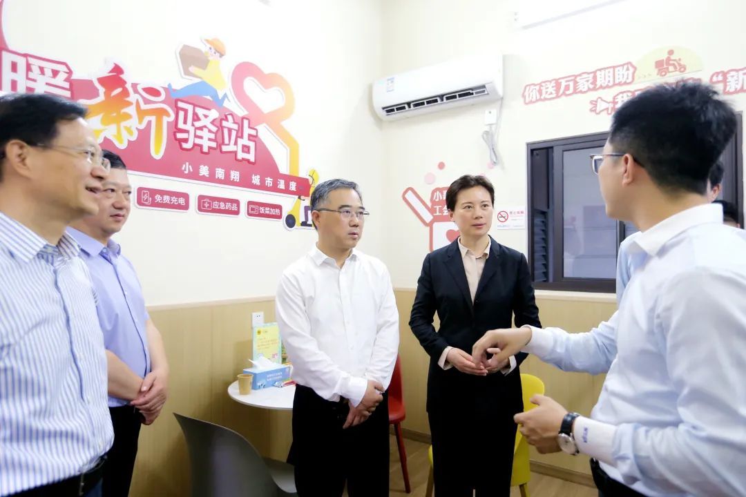 在南翔印象城MEGA,沈军一行参观了户外职工爱心接力站、爱心妈咪小屋、商圈工会活动中心和职工运动基地,并听取了印象城运营和商圈联合工会工作介绍。沈军感谢企业愿意为户外职工、商圈工会、商圈职工等人群提供空间。她表示,要以工会为纽带,进一步激发商圈工会活力,提升工会组织的影响力、凝聚力和向心力,把服务送到职工身边。