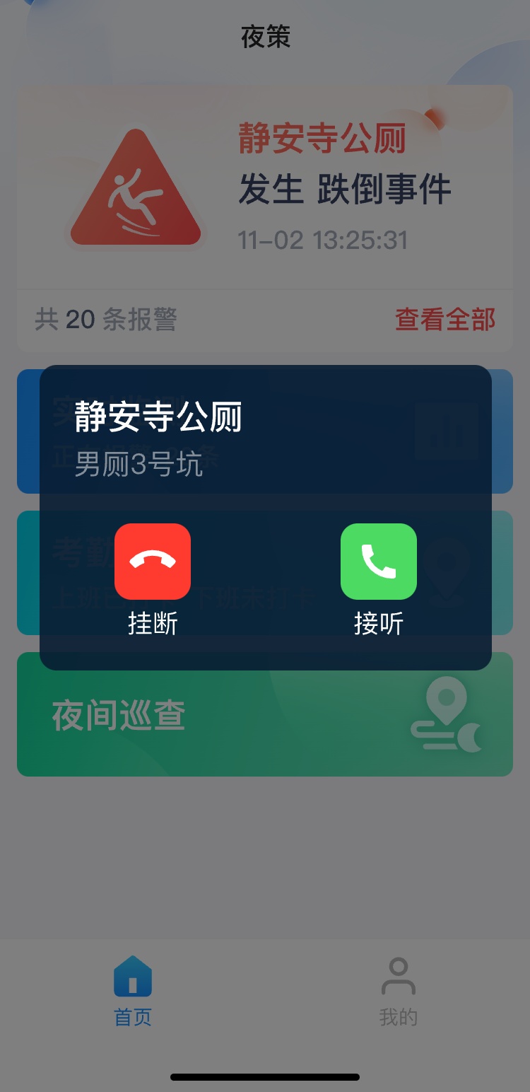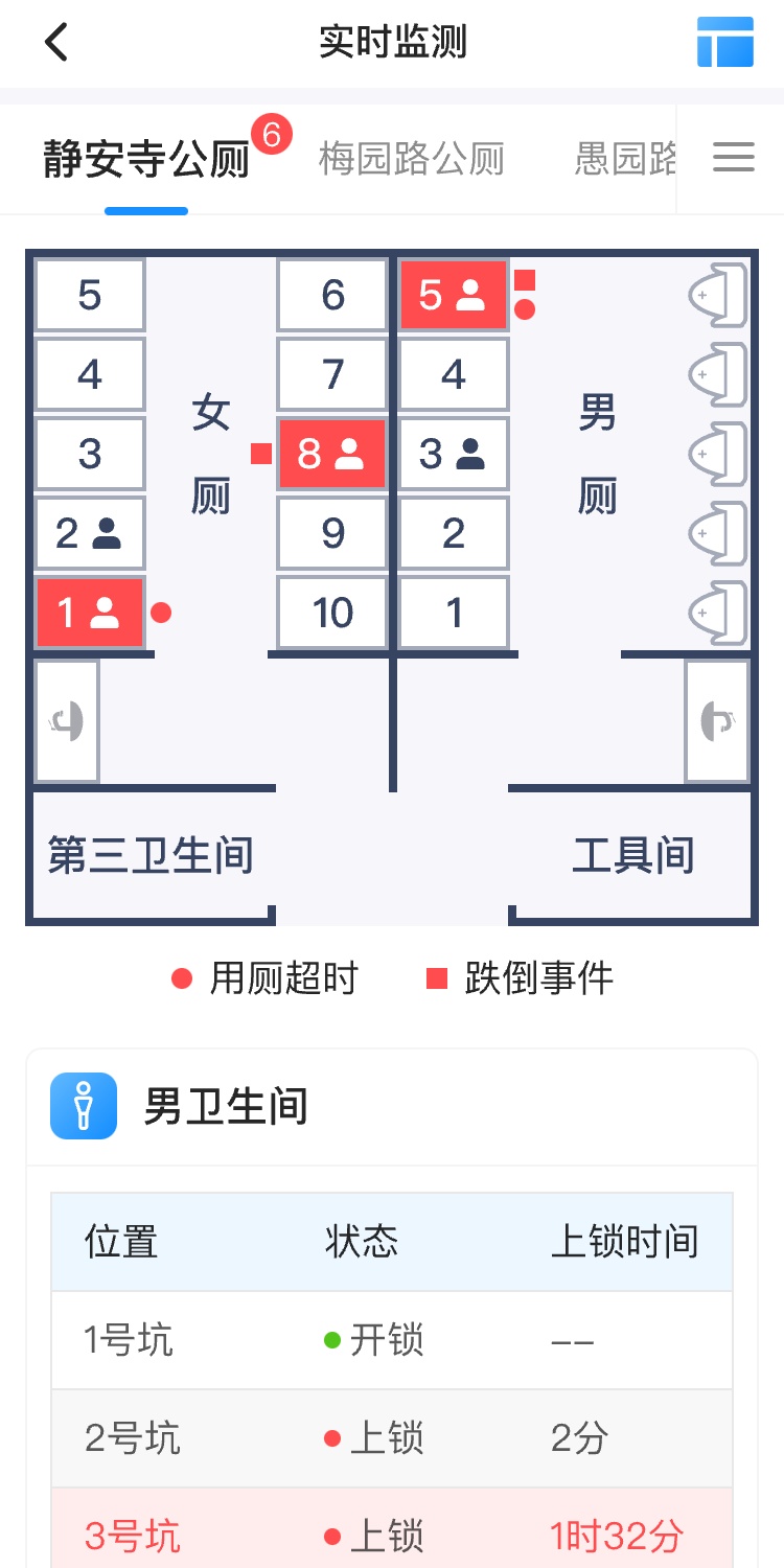 结合蹲位监测设备(占用情况与计时统计功能),当如厕时间超过正常用时上限时,系统将发起提示,周边定点24小时公厕保洁员或后台管理人员可即时发起通话,快速了解现场状况,以提供高效的帮助。