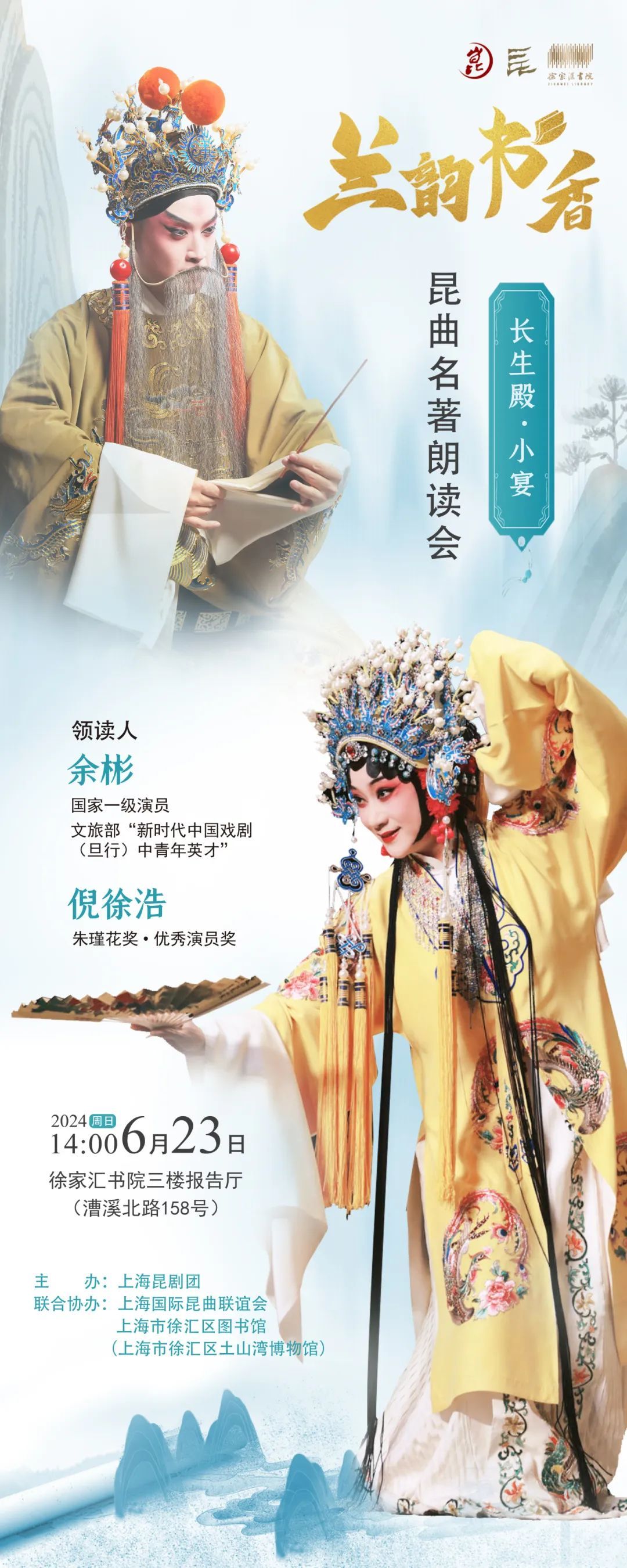 6月23日,由上海昆剧团主办、上海国际昆曲联谊会和徐汇区图书馆(徐汇区土山湾博物馆)联合举办的“兰韵书香”昆曲名著朗读会,将再次来到人文打卡地——徐家汇书院。本次活动邀请了上海昆剧团国家一级演员、文旅部“新时代中国戏剧(旦行)中青年英才”荣誉获得者余彬和上海昆剧团优秀青年演员、朱瑾花奖·优秀演员奖获得者倪徐浩,通过《长生殿·小宴》的朗读与演绎,将唐明皇和杨贵妃的爱情故事与昆曲的美学艺术串联,让读者一起沉浸于昆曲的诗意世界中。