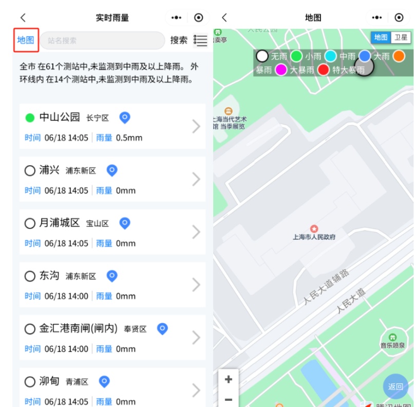点击左上角“地图”按钮,一键查看实时上海雨量地图。