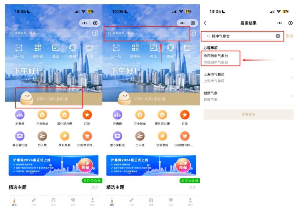 或打开“随申办市民云”(APP、微信小程序、支付宝小程序),在首页搜索框输入“随申气象台”进入。