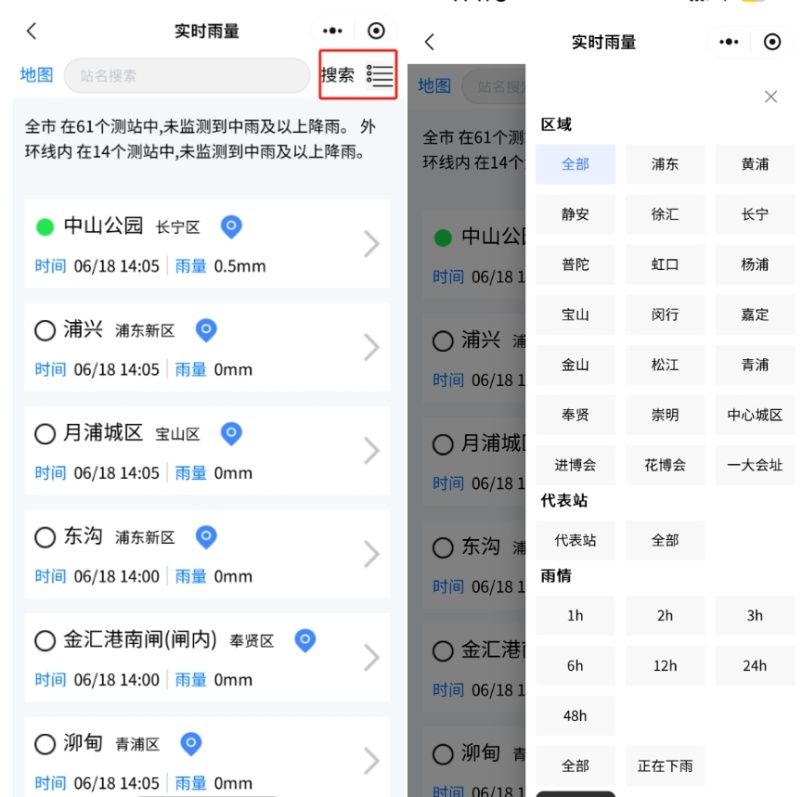 通过点击右上角按钮可根据区域、代表站、雨情等标签进行筛选查找。