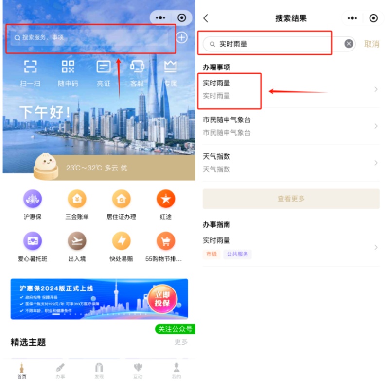 打开“随申办市民云”(APP、微信小程序、支付宝小程序),首页搜索“实时雨量”并点击进入即可查看。