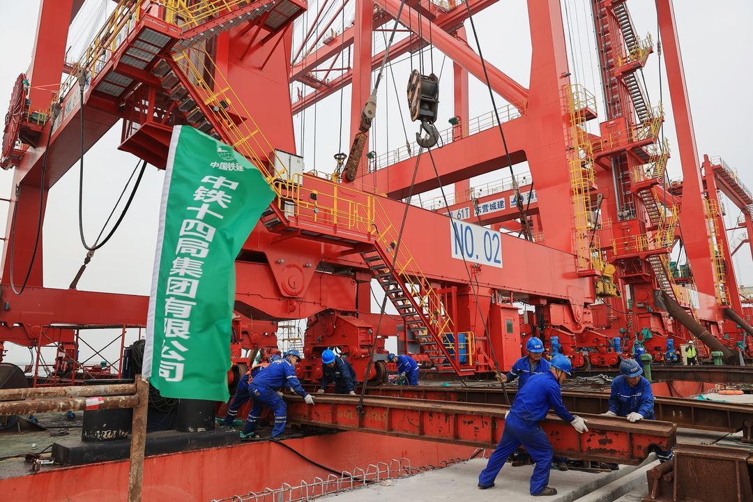 中铁十四局施工负责人表示:“本次进场的港机设备为2台集装箱岸桥和6台集装箱场桥,对进出港货物进行装卸和场内转运。岸桥总高度为75.6米,外伸距为55米,单台设备重约1200吨,采用整机滚装方式上岸”。为确保岸桥如期进场,项目部提前策划,通过与海事局、生产厂家等相关单位多方协调,确定整机上岸方案,责任到人,确保安全、质量、精度等各环节控制万无一失。