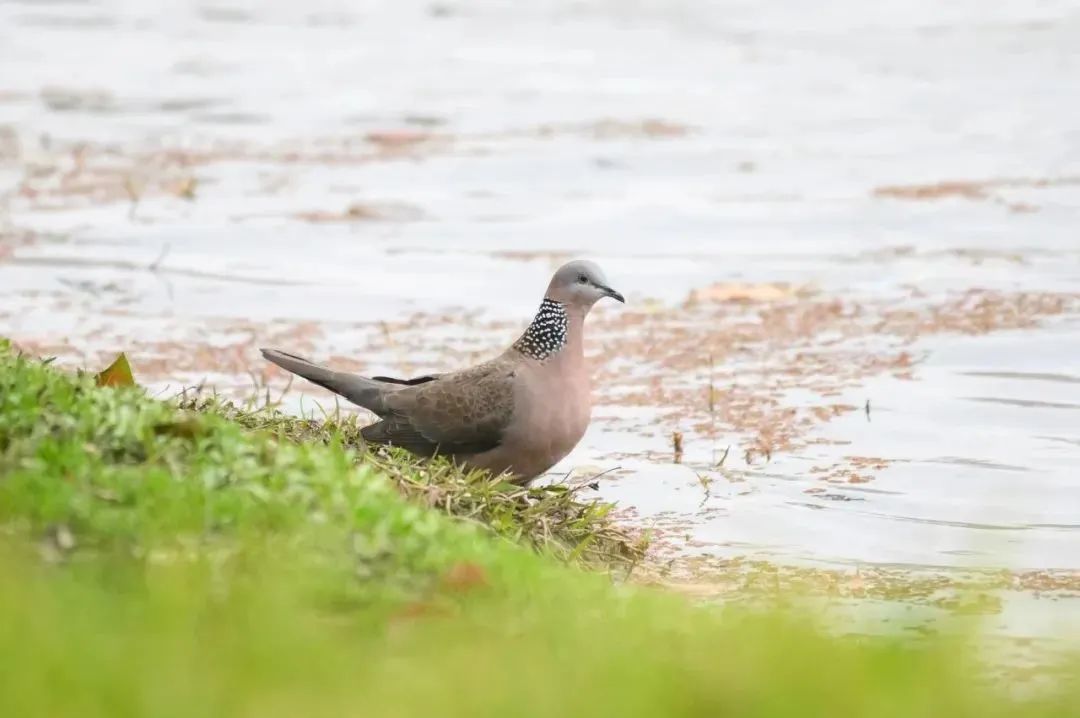 为上海市常见野生鸟类,上体大都褐色,下体粉红色,后颈有黑色领圈延伸至前段,其上满布白色斑点。主要取食各种植物种子和果实,常见于公园小区,多在居民阳台等处搭窝。