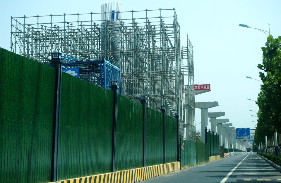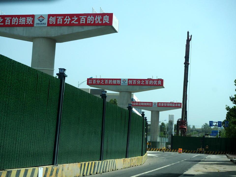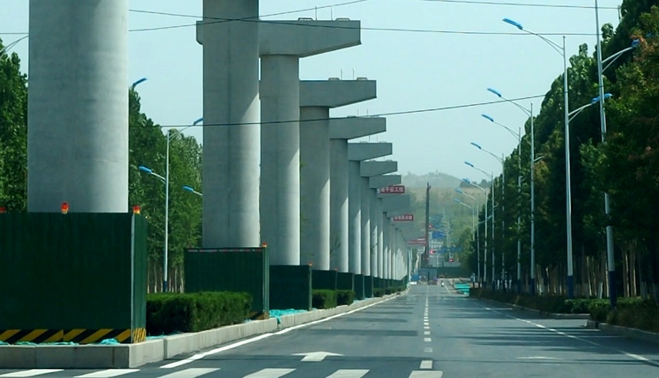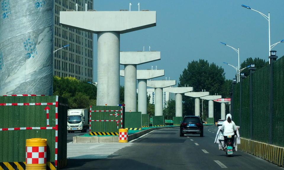 6月24日,济南东部城区的春园路和科创路上,济南云巴的轨道基础建设正在进行。数百根高架轨道墩柱已经完工,等候架设箱梁等后续工程。车站建设也在同步进行中。
