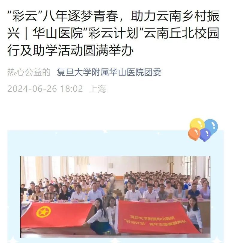 早在2016年5月,华山医院与丘北县人民政府及丘北县人民医院签订结对帮扶协议之时,华山医务青年便了解到云南山区需要帮扶的不仅仅是医疗技术,还有孩子们的“大学梦”,于是发起了华山医院“彩云计划”志愿服务活动。该计划连续八年筹集善款,资助品学兼优但家庭困难的云南学生的求学之路,并开展校园科普宣教、励志演讲、图书捐赠、山区义诊等公益行动,鼓励孩子们勇于追梦、勤于追梦,公益足迹遍布云南2个州、6个县、8个乡。