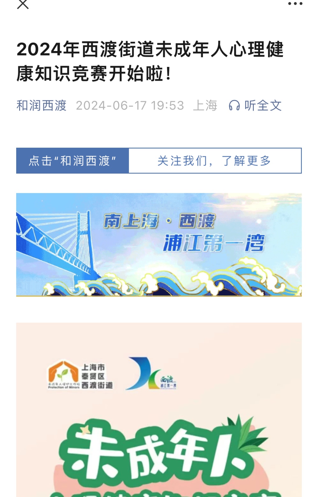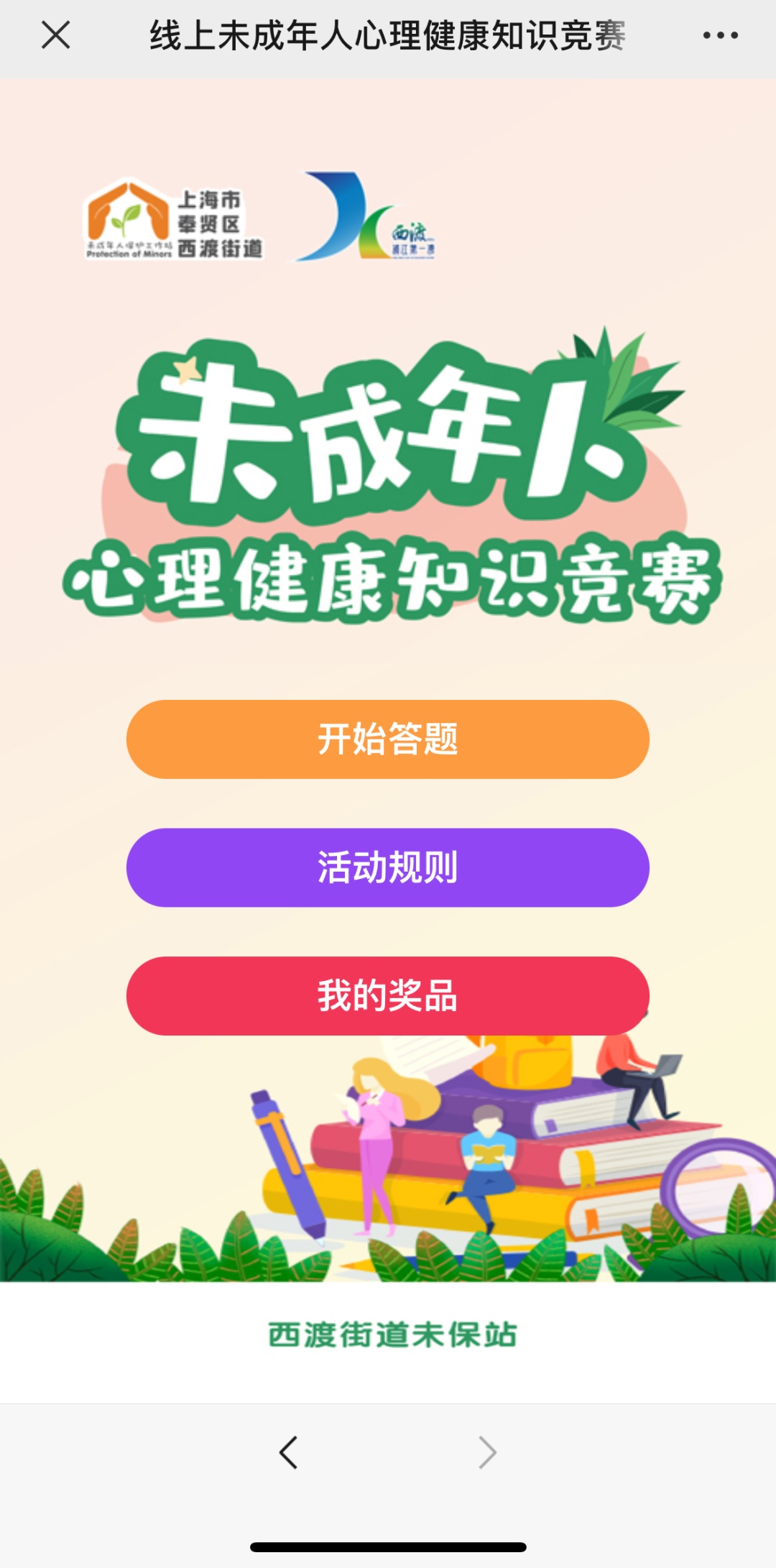 6月17日至23日,开展线上未成年人心理健康知识有奖竞赛活动,通过“和润西渡”微信公众号发布,并在辖区村居民和各学校内广泛宣传,共有200余人参与,送出50份奖品。