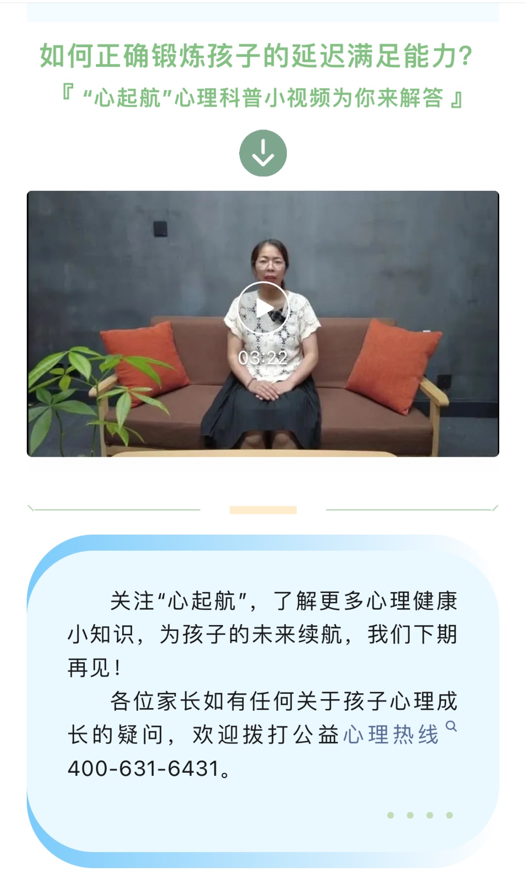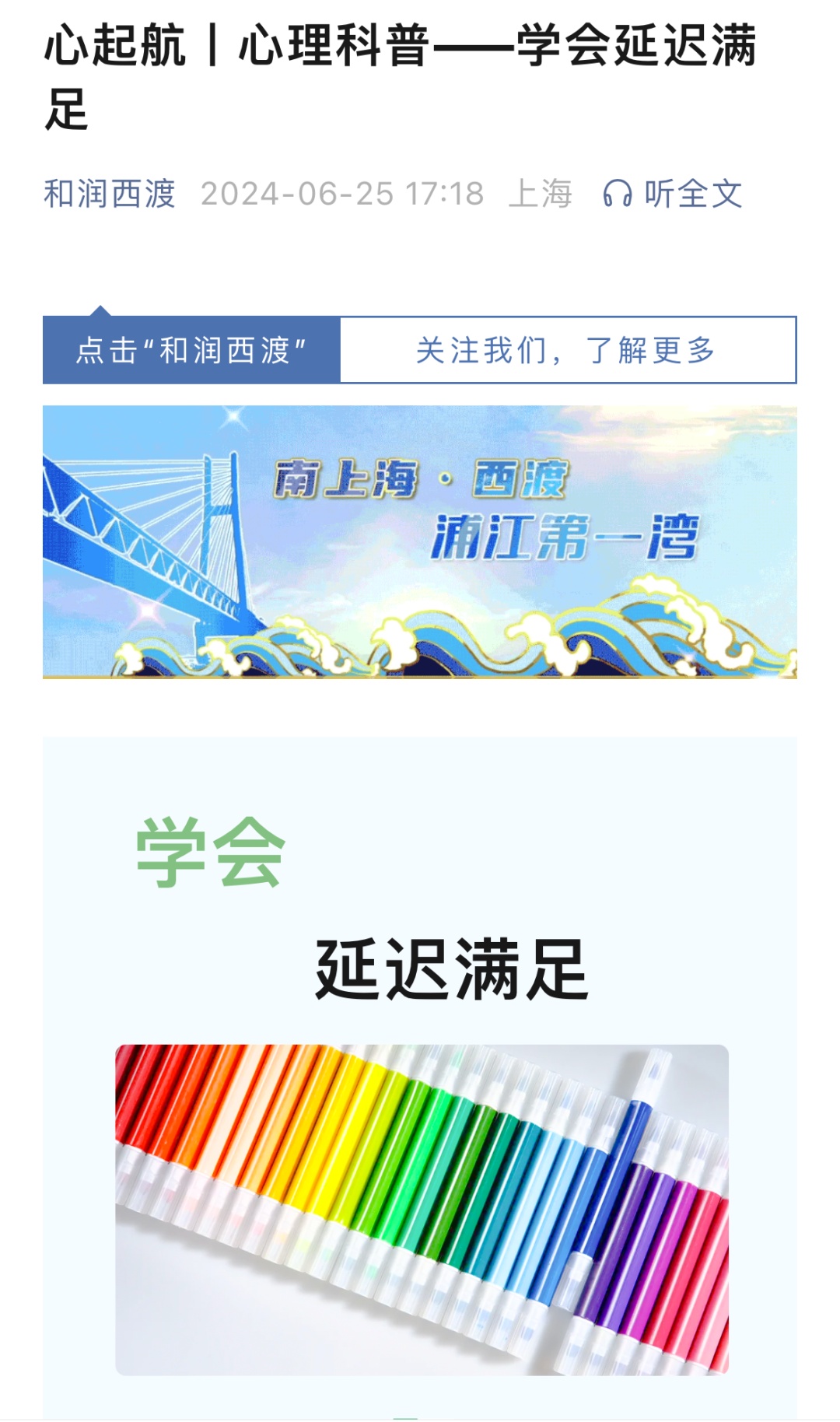 6月25日,通过“和润西渡”微信公众号推送1期心理健康科普小视频——学会延迟满足,帮助家长学习如何正确锻炼孩子们的延迟满足能力,养成自律的良好习惯。