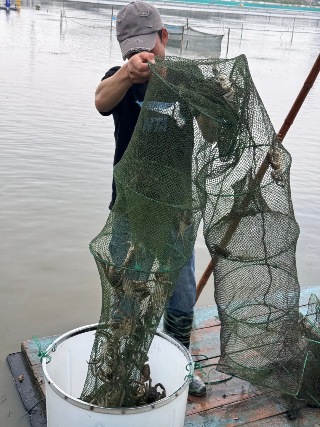 26日下午,记者在该基地看到,蟹农正划着小船在池塘起网收蟹。只见地笼里满是螃蟹,蟹农熟练地将“六月黄”倒进桶里,随手挑了两只“大块头”,称一称足足有3两重。
