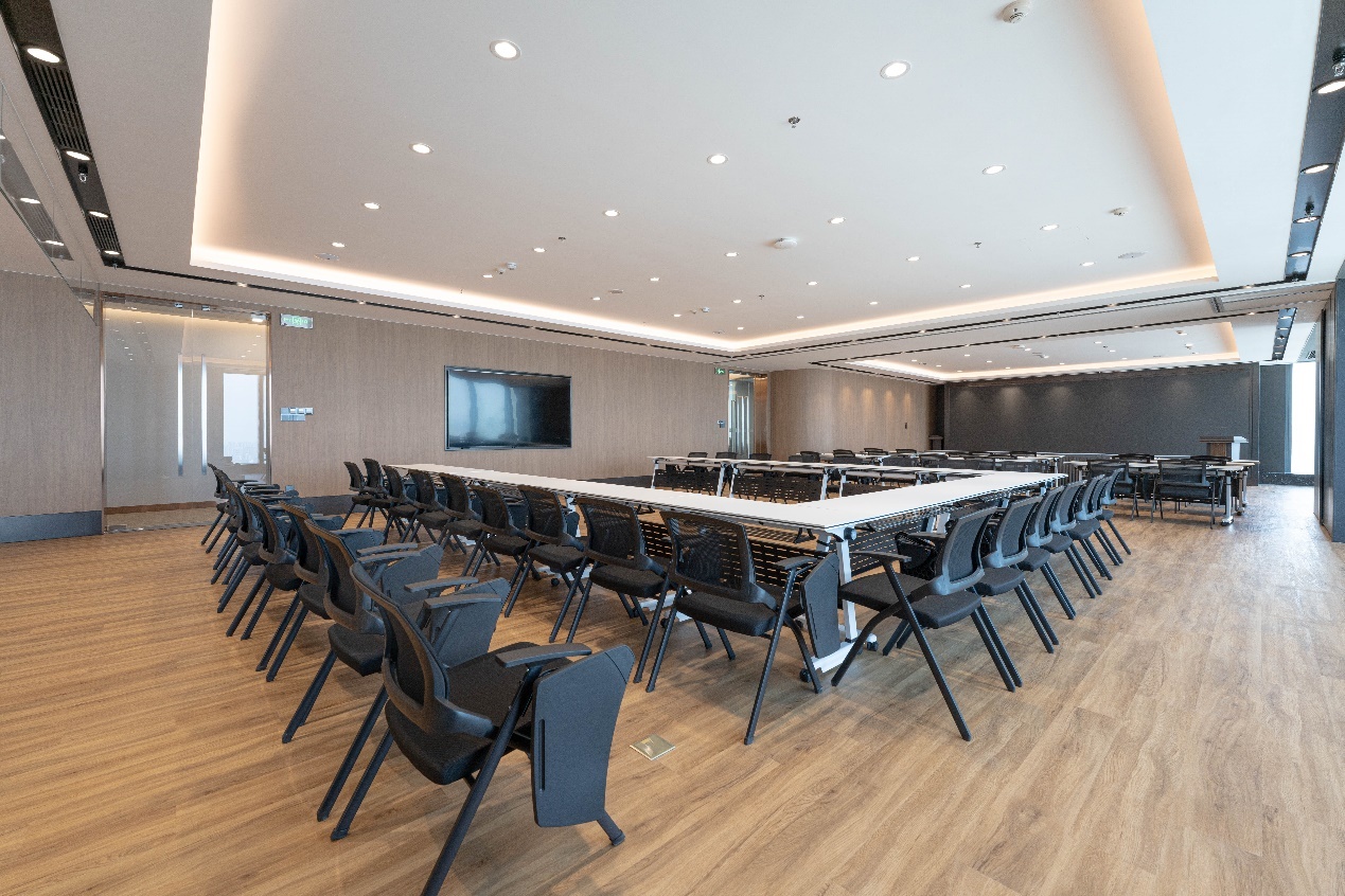 多规模智能化会议室:包括董事会议室、中型会议室、贵宾洽谈室和小型洽谈室等,为企业高管和决策者提供了私密性与舒适度兼备的会议活动环境。