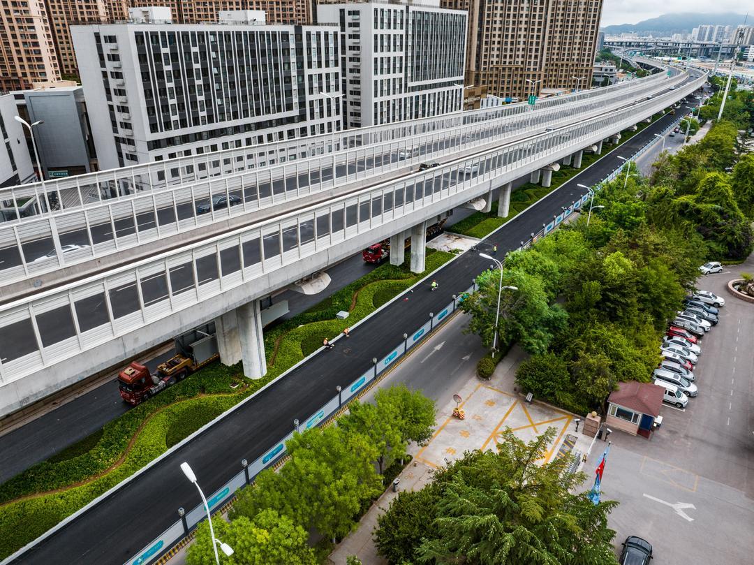 施工过程中,各参建单位科学规划交通流线,合理优化交通组织方案,全力降低道路施工对交通的影响。“为保证顺利完成二次调流,我们在交警部门指导下,不断优化完善交通调流方案,采取远端提前疏导、近端人工引导等措施,在保证施工作业面的同时,确保道路交通通畅和居民出行安全。”青岛市政集团第一市政公司陈昆明说。为提升地面道路整体施工管理水平,打造精品工程,在青岛市住房城乡建设局指导下,青岛城发集团建立了“一图、两表、五清单”的精细化管控体系,施工过程坚持样板先行,加强细节把控,积极应用新型材料和工艺,如沥青摊铺采用五层连铺工艺,有效缩短施工周期,提升了道路结构层的整体性和抗裂性,同时减少噪音和扬尘污染;应用新型防沉降井盖,采用“承插式”设计,具有防沉降、防盗、减震降噪效果;应用新型雨水箅子,采用宽边结构设计,提升抗压、抗损和汛期排水能力;广泛应用预制仿石路缘石,经济实用、美观大方,增强耐久性和抗风化性,降低后期维护成本。“在人行道样板段铺装过程中,我们通过精细化施工管控,确保铺装表面平整,标高控制准确,线性顺直,提升行走舒适性。下一步我们将全力冲刺7月底地面道路通车目标,坚决打赢重点项目攻坚战。”青岛中建联合集团有限公司项目经理邢国富介绍说。