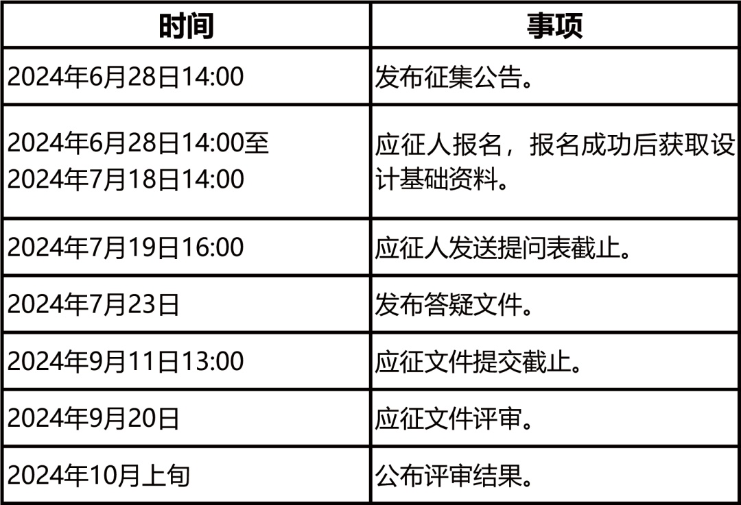 本次征集分为三个阶段进行。 应征报名 有意参与本次高校征集的潜在应征人可根据本公告第8条所述报名。 方案设计 应征人报名后即可开展设计工作,并根据本公告第5条所列时间安排,按时提交应征文件。本次征集成果形式为全电子文件,以便境内外师生参与。 方案评审 在收到每位应征人提交的应征文件后,指导单位、主办单位和征集代理将组建方案评审委员会,对各应征文件进行综合评比,并评选出相应奖项的作品。