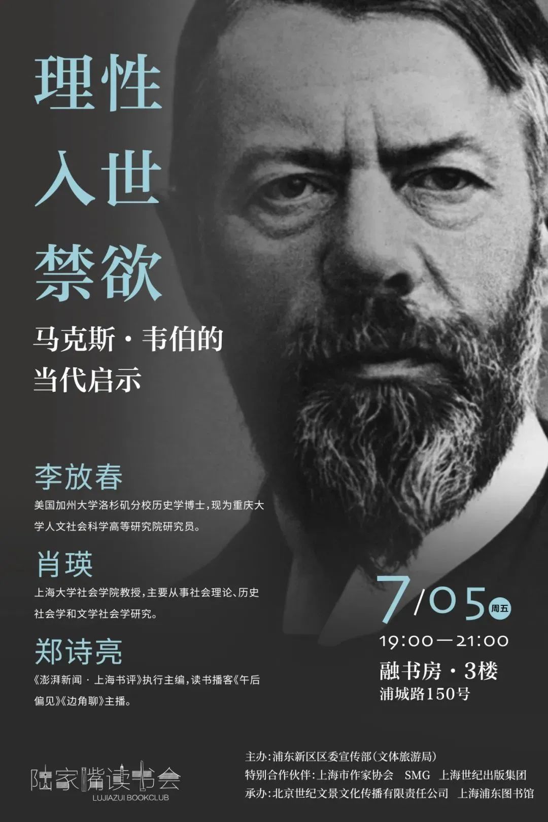 只要现代性的历史不终结,韦伯的洞见和思考方式就不会过时。本周五(7月5日)19:00—21:00,我们邀请到重庆大学人文社会科学高等研究院研究员、《理性的反讽:韦伯〈新教伦理与资本主义精神〉导读》作者李放春、上海大学社会学院教授肖瑛、《澎湃新闻·上海书评》执行主编郑诗亮,从多重视角出发,谈谈马克斯·韦伯的当代启示。