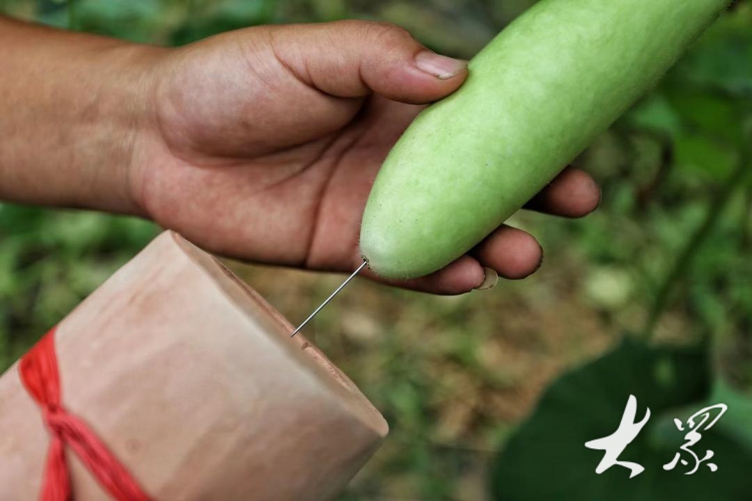 6月26日清晨四点,刘腾潇便开始了他一天的工作,他腰上系着数十根红绳进入葫芦大棚,忙碌于为葫芦套上精心设计的模具。几个小时的辛勤工作后,他简单吃完早餐便转入工作室,专注于设计适合推广的花模。