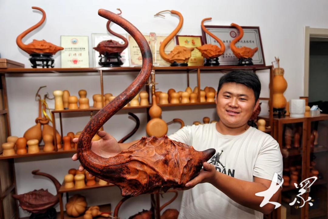这一切源于一次偶然的机会,刘腾潇了解到葫芦种植及其工艺品制作大有可为。通过多方查阅资料,了解最新市场行情,他最终决定在“小葫芦”上做一番带领乡亲走上致富路的“大文章”。