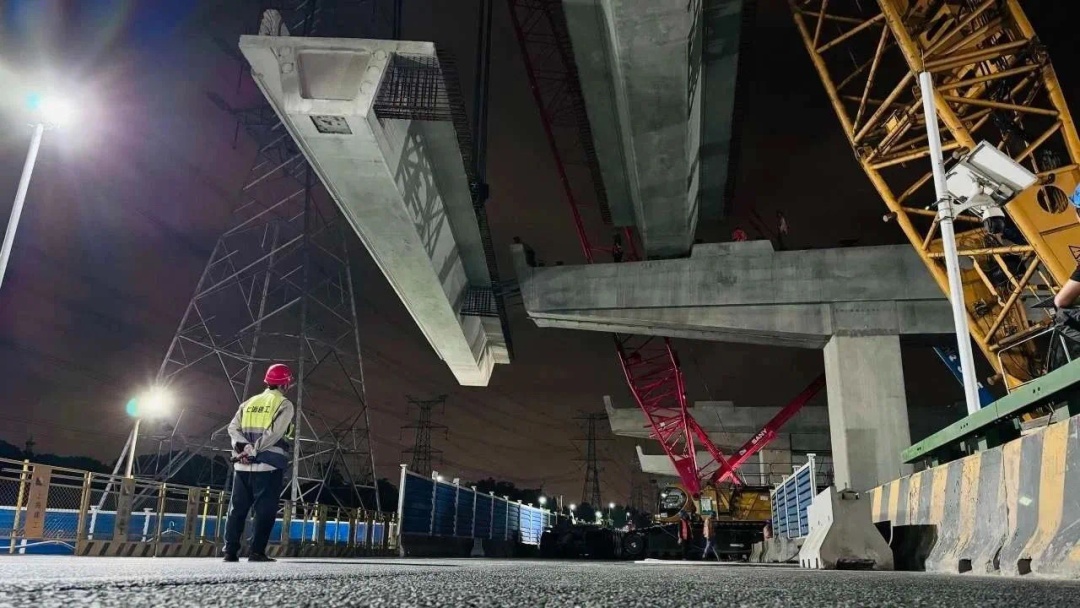 外环东段首榀预制箱梁的架设现场图