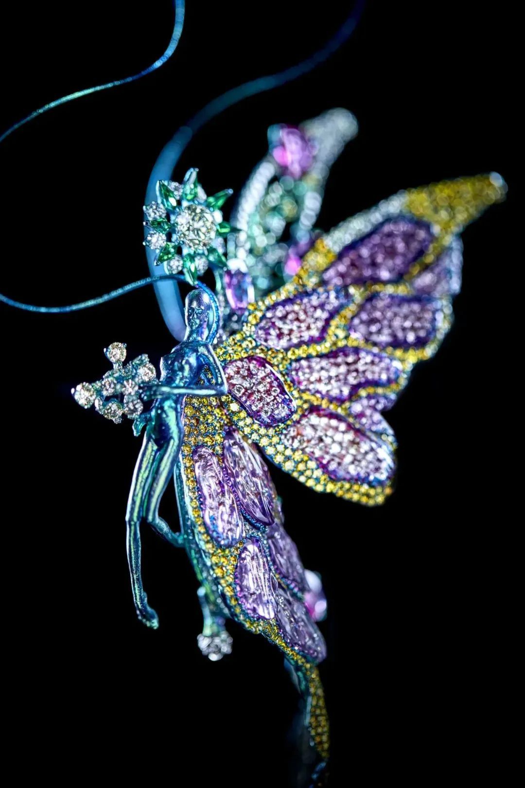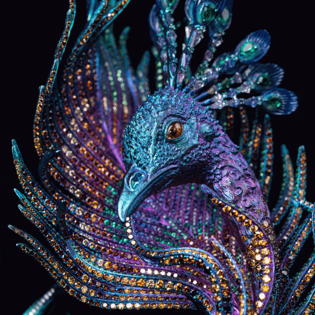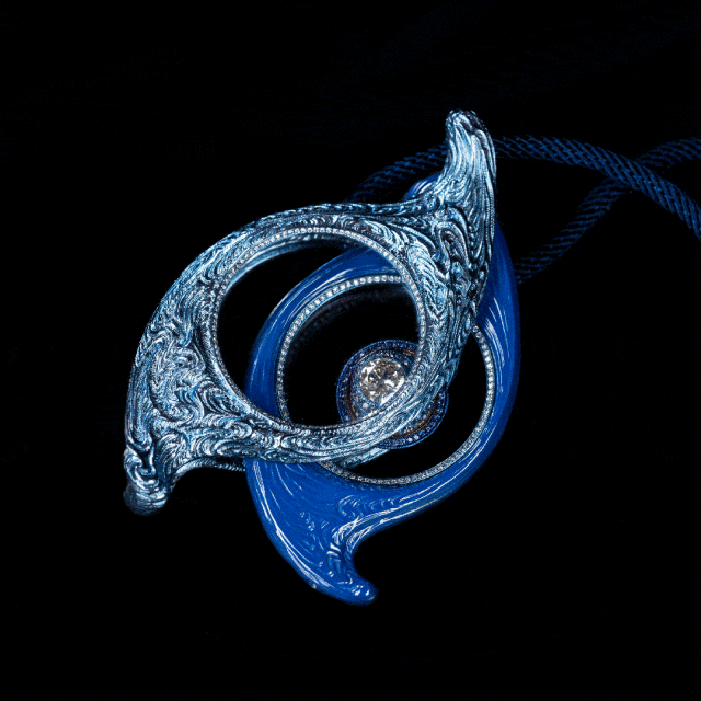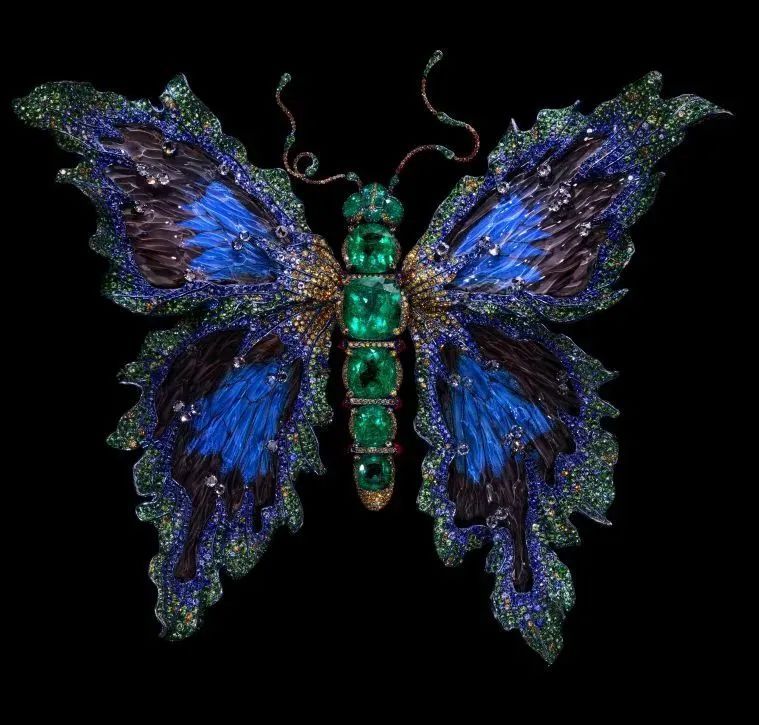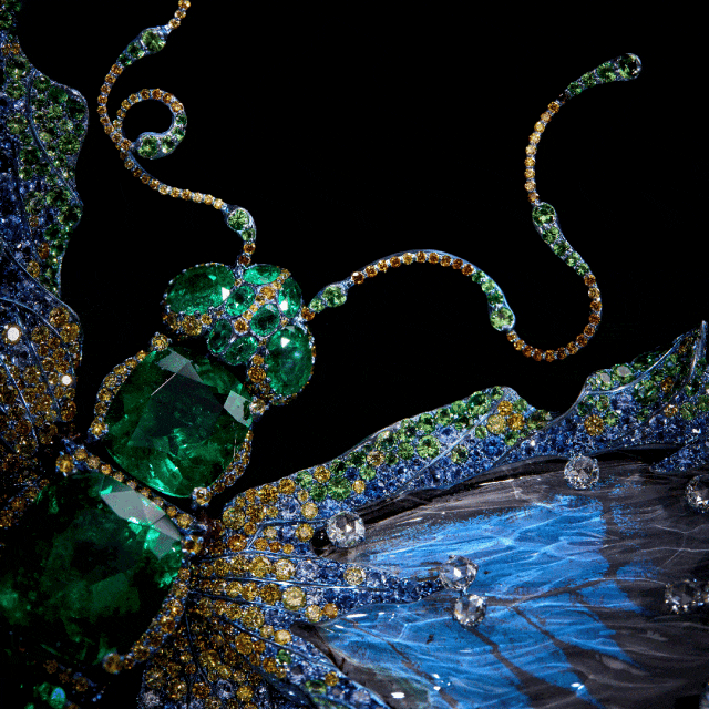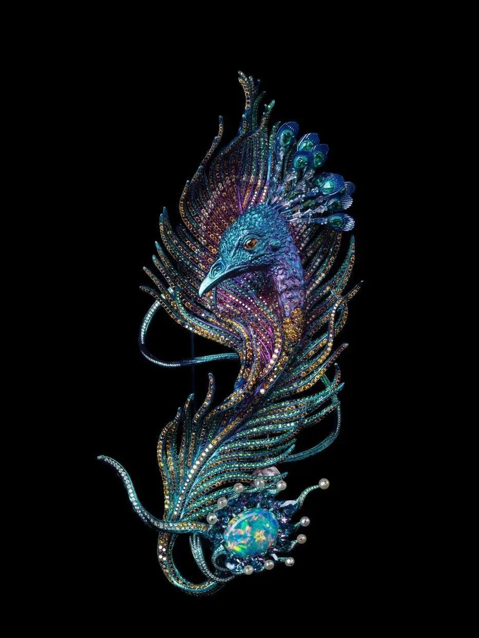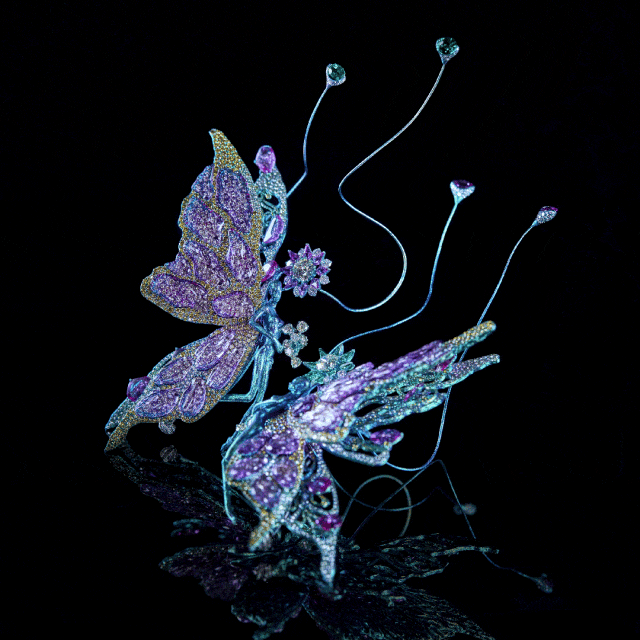 例如,作品《蝴蝶星云》运用钛金属结合微雕祥云纹路,镶嵌闪钻和彩色宝石,呈现出宇宙的壮丽与神秘。作品《化蝶》捕捉蝴蝶美好的色彩,利用水晶高折射的特质,配以各种宝石和贵金属,使其在自然光下展现出独一无二的璀璨光芒,美态足以媲美真实蝴蝶。