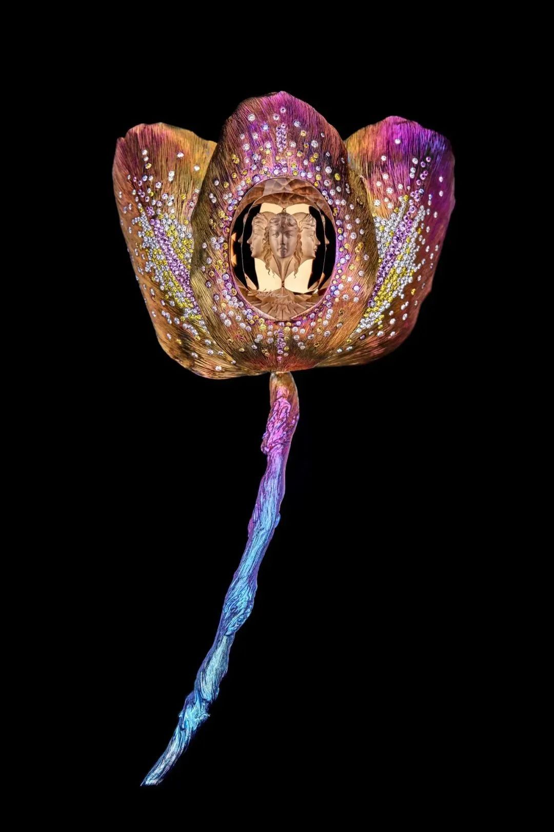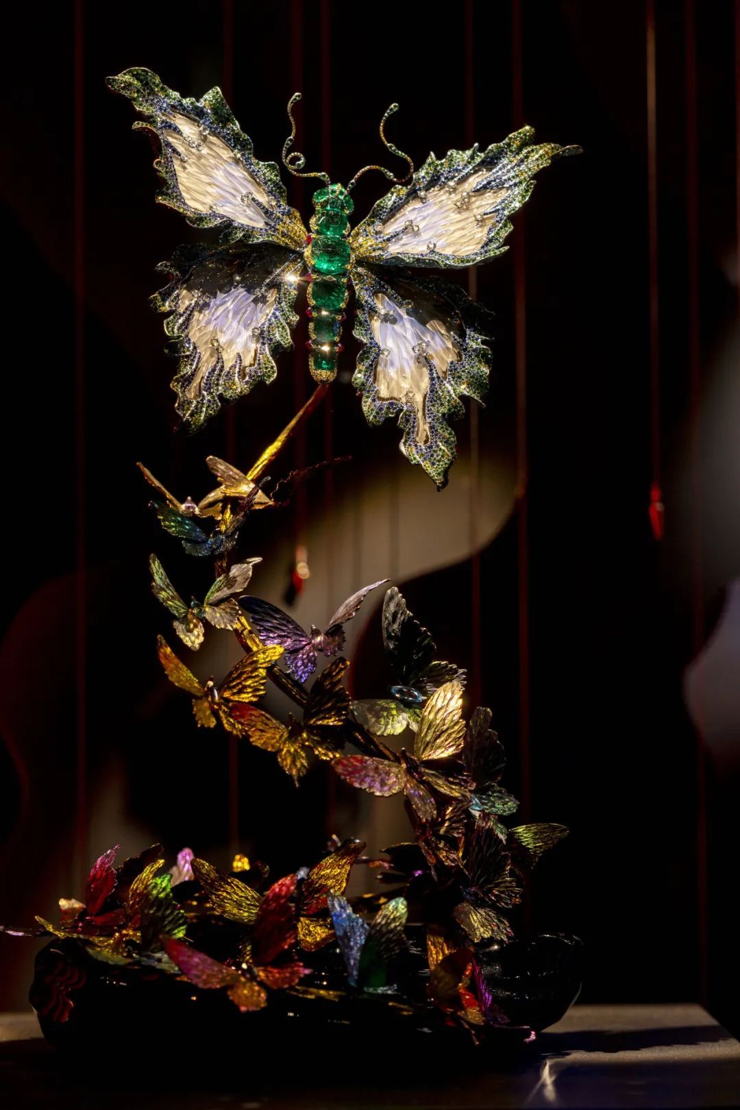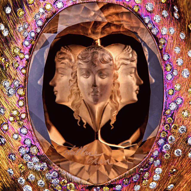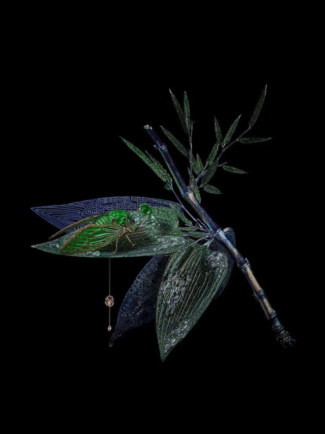 例如,作品《蝴蝶星云》运用钛金属结合微雕祥云纹路,镶嵌闪钻和彩色宝石,呈现出宇宙的壮丽与神秘。作品《化蝶》捕捉蝴蝶美好的色彩,利用水晶高折射的特质,配以各种宝石和贵金属,使其在自然光下展现出独一无二的璀璨光芒,美态足以媲美真实蝴蝶。
